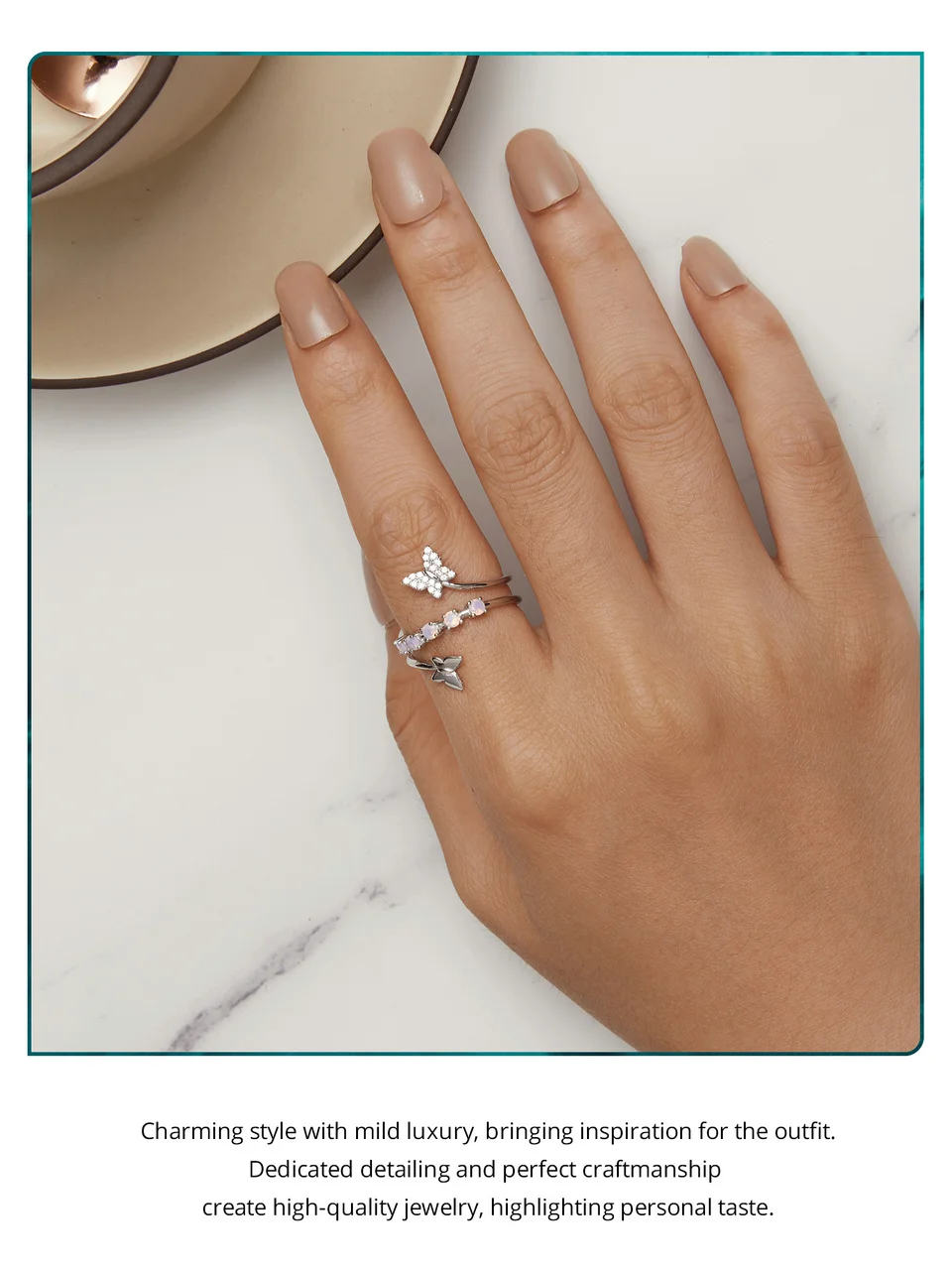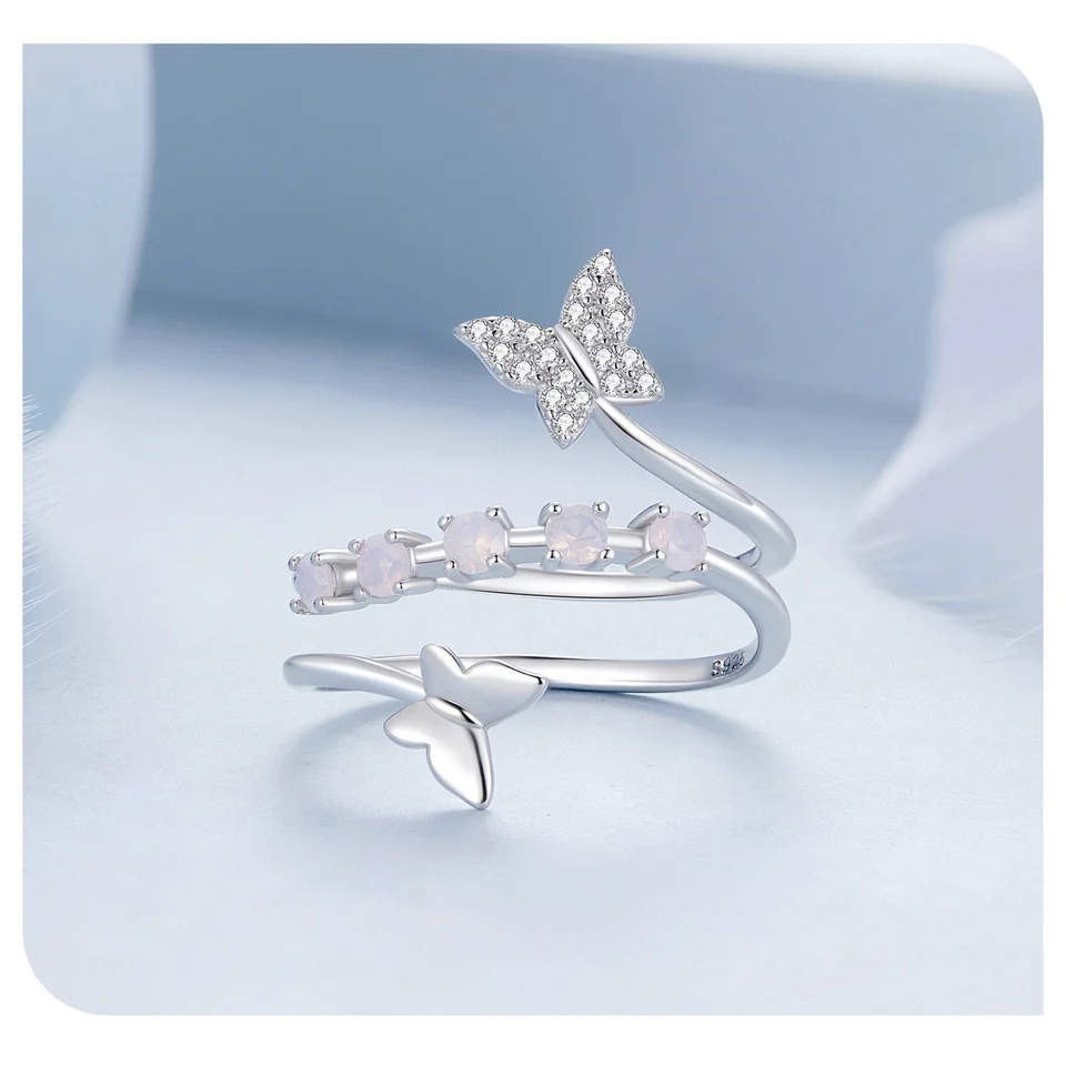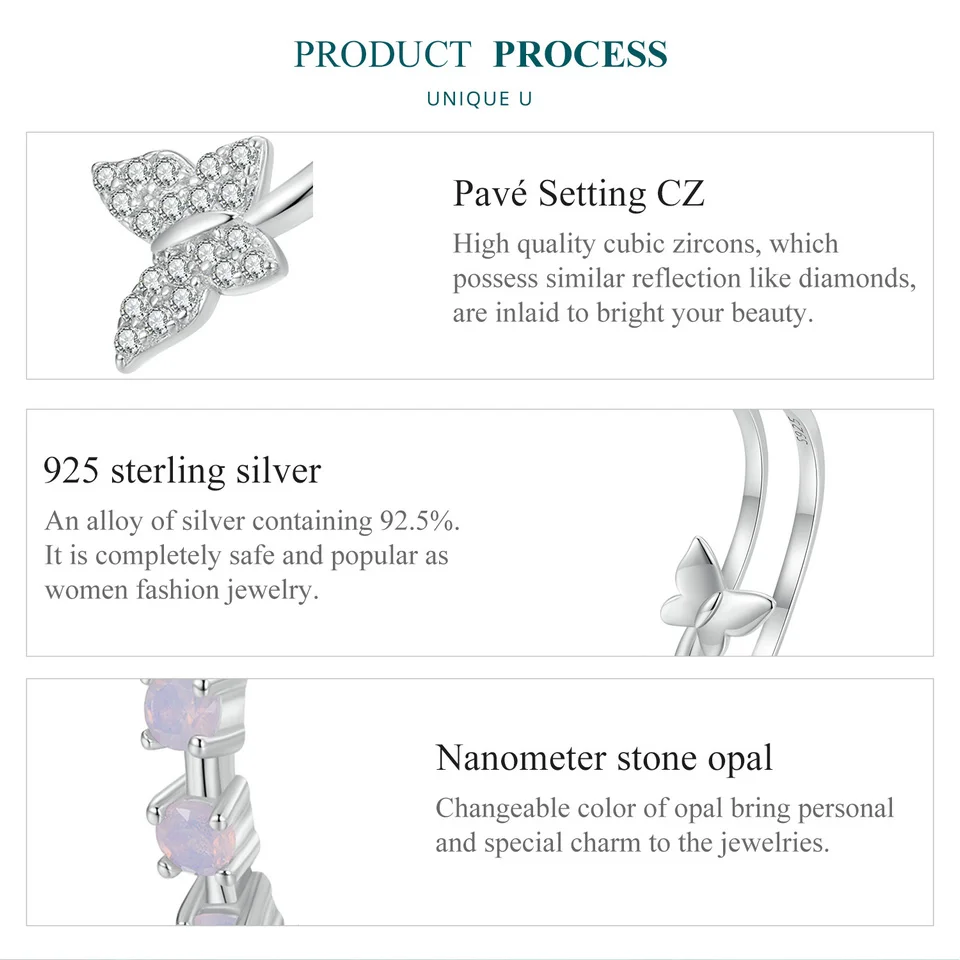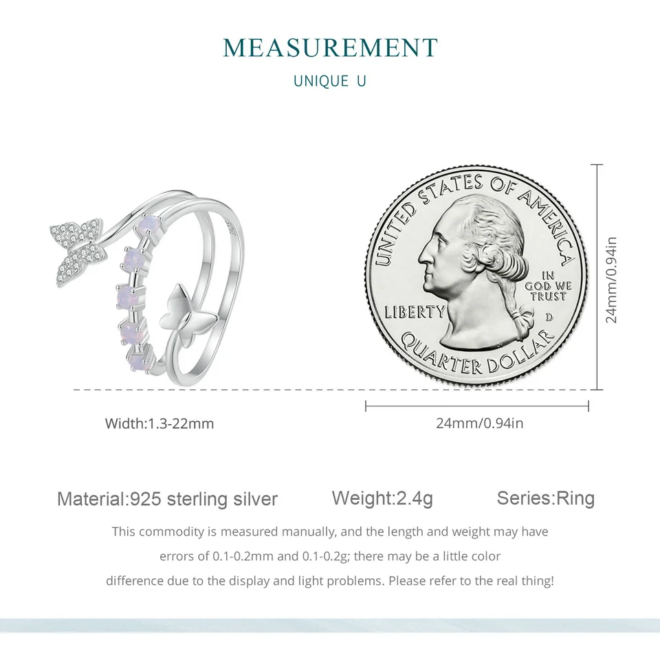 ❤ [Description]Dancing butterflies rest on the fingertips, and the ring is decorated with iridescent nano opals, showing a sweet temperament.