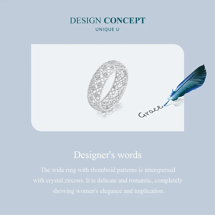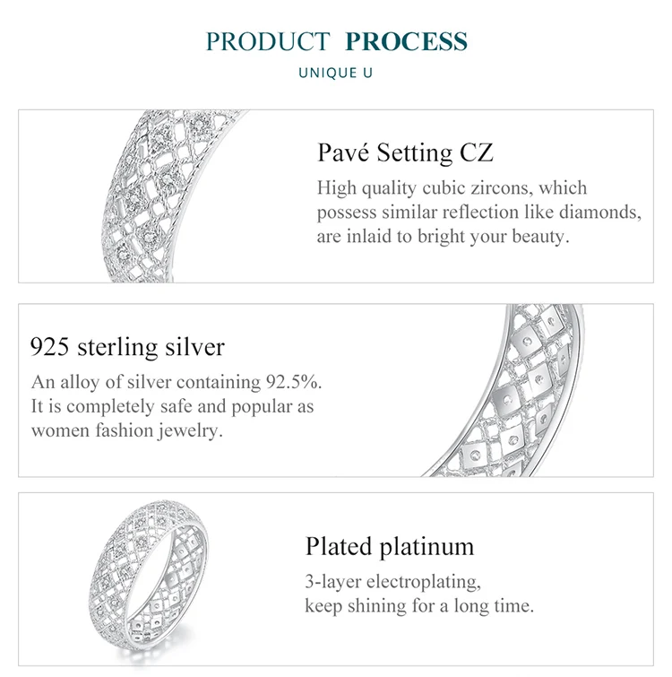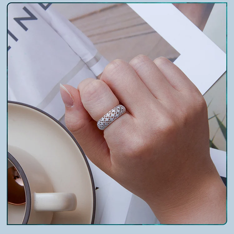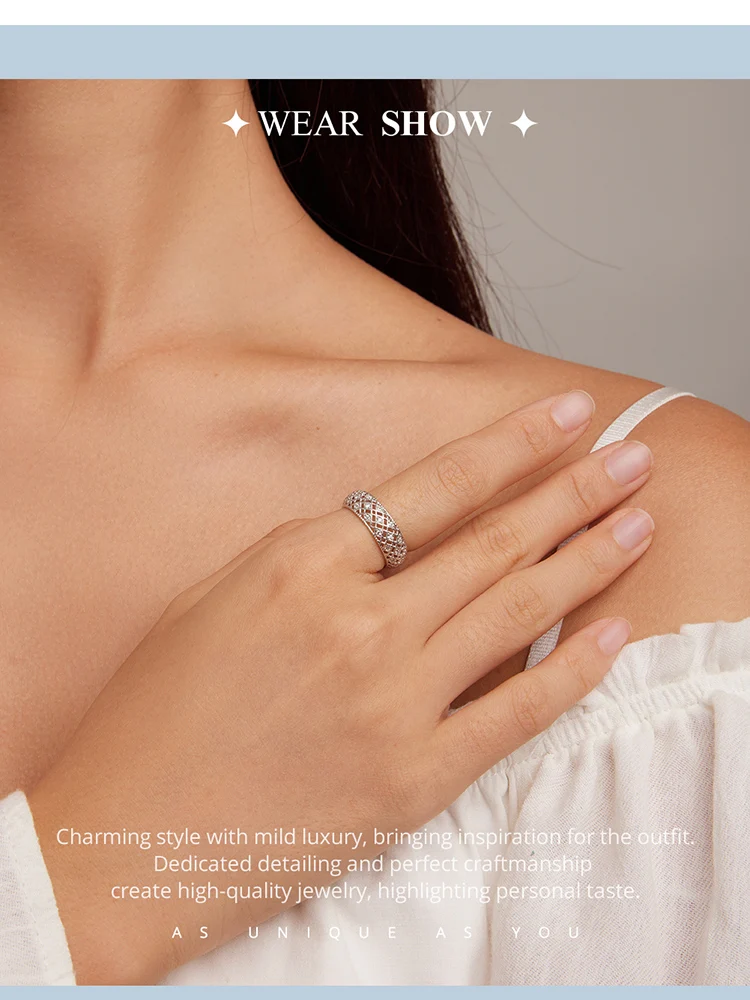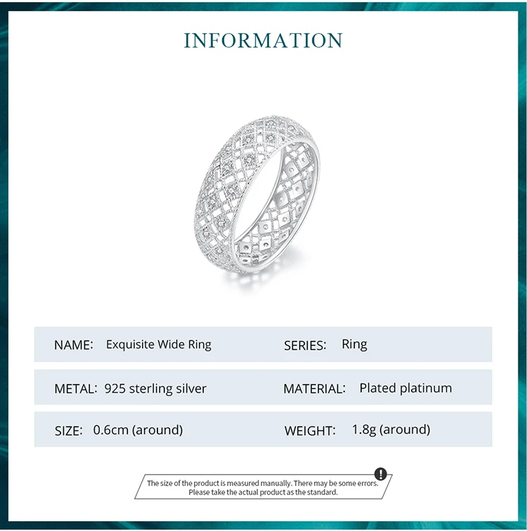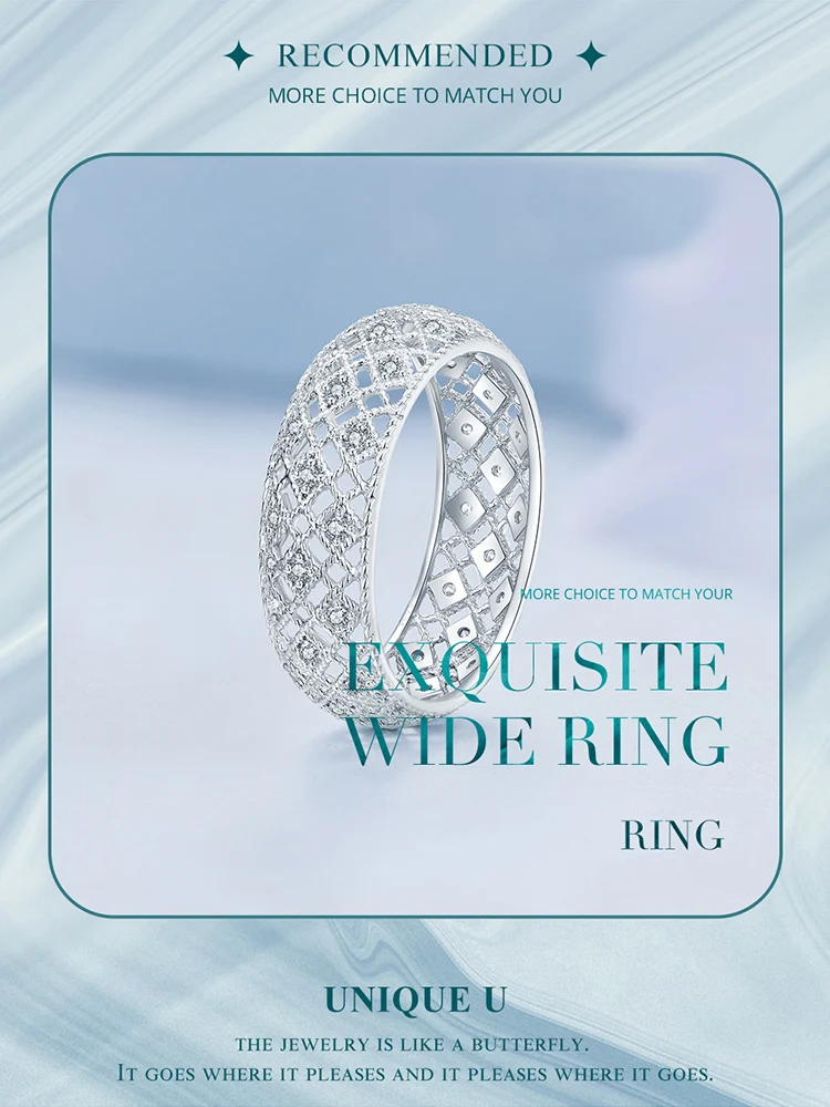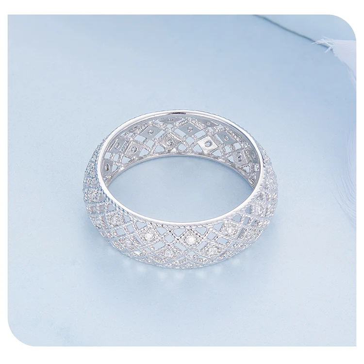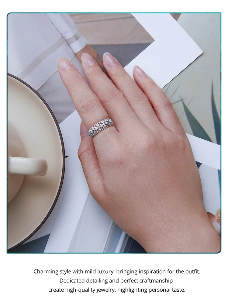 ❤ [Description] The wide ring with rhomboid patterns is interspersed with crystal zircons. It is delicate and romantic, completely showing women's elegance and implication.