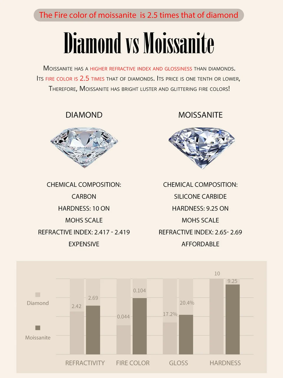 Moissanite is one of the hardest substances in the world. It is created in the laboratory, which makes the gemstone with eternal brilliance. As the best alternative to diamond, it stacks up in color, clarity, and brilliance. The fire and brilliance of moissanite far exceed that of the diamond.