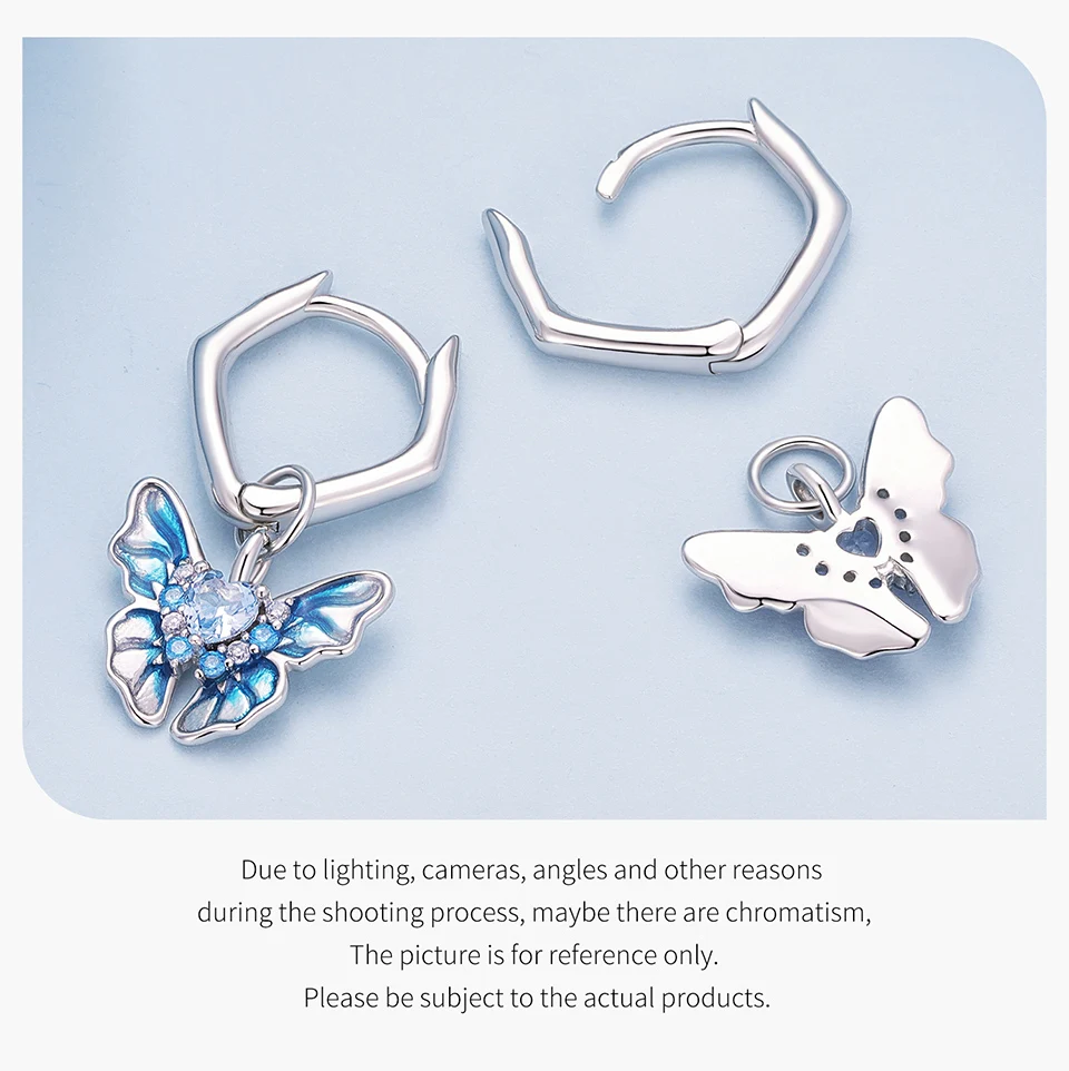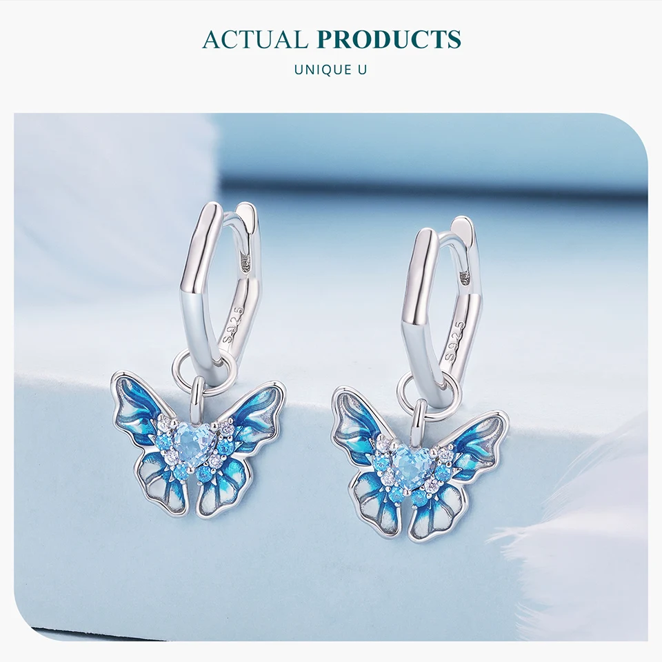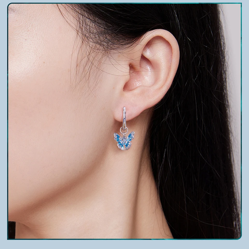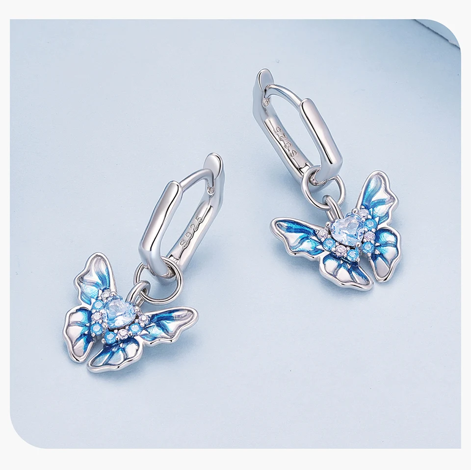 Bamoer 925 Sterling Silver Blue Butterfly Ear Buckles Heart Shape Hoop Earrings for Women Pave Setting CZ Fine Jewelry