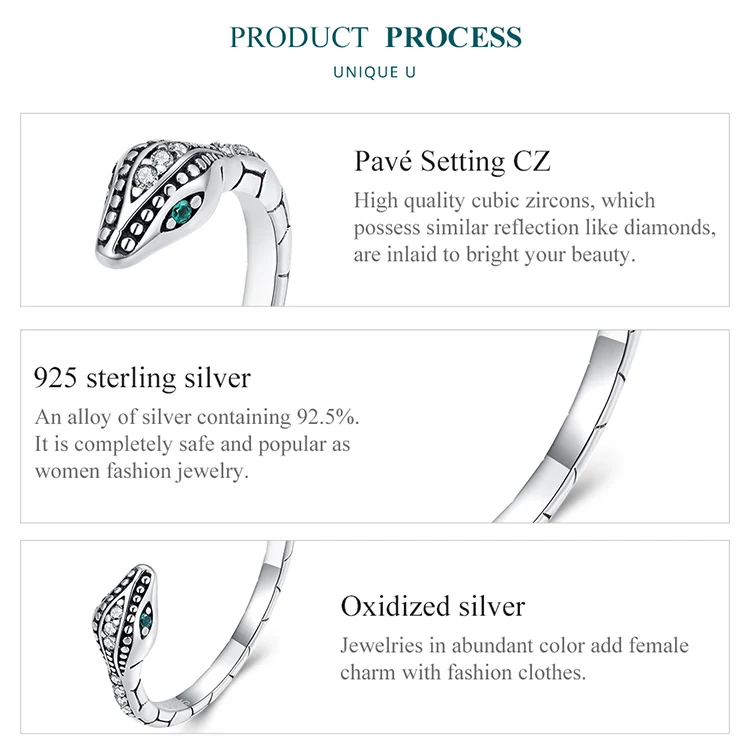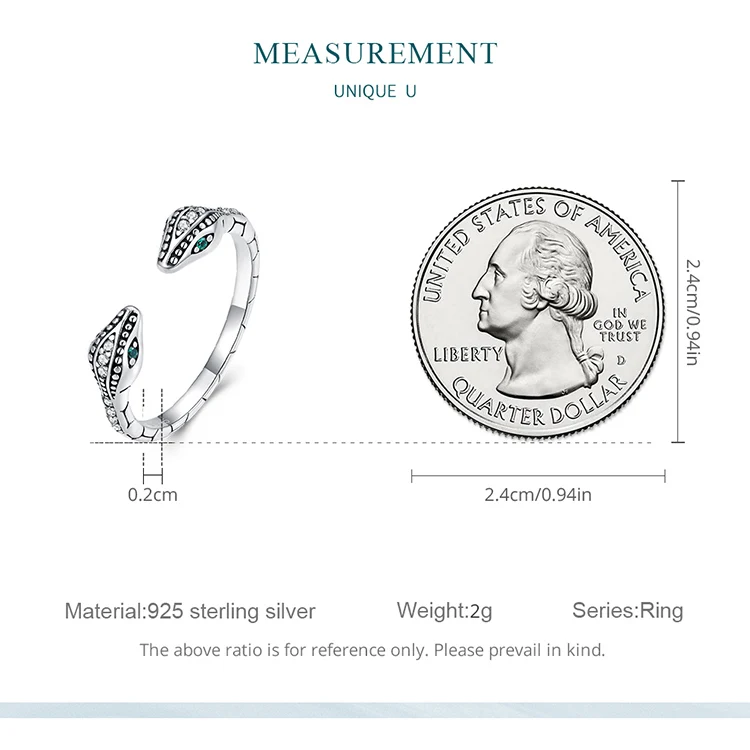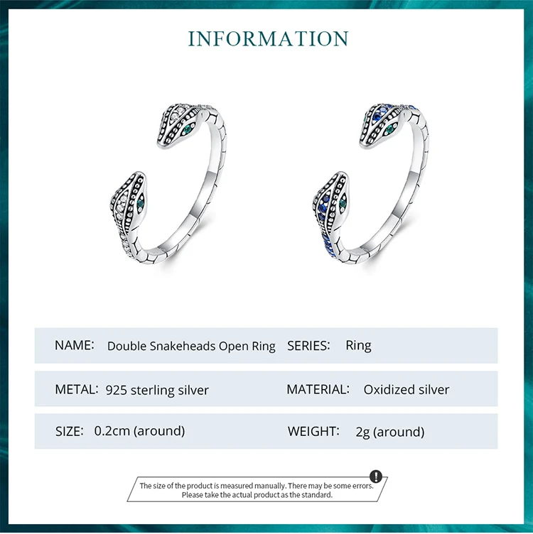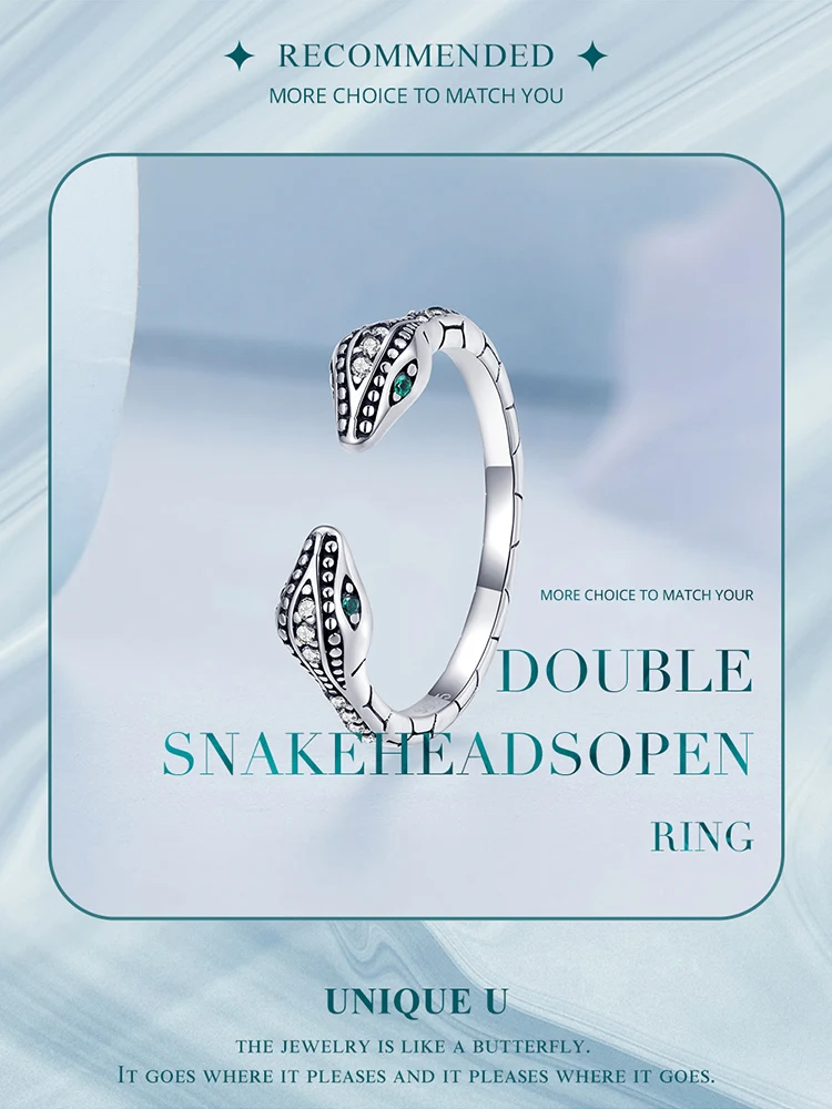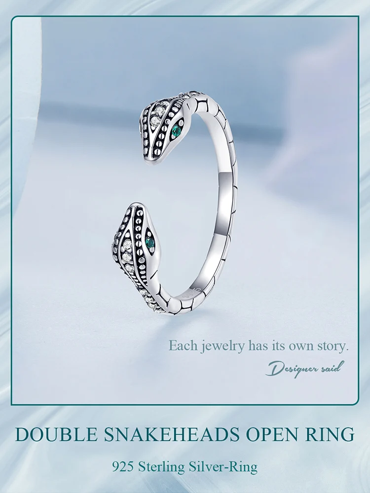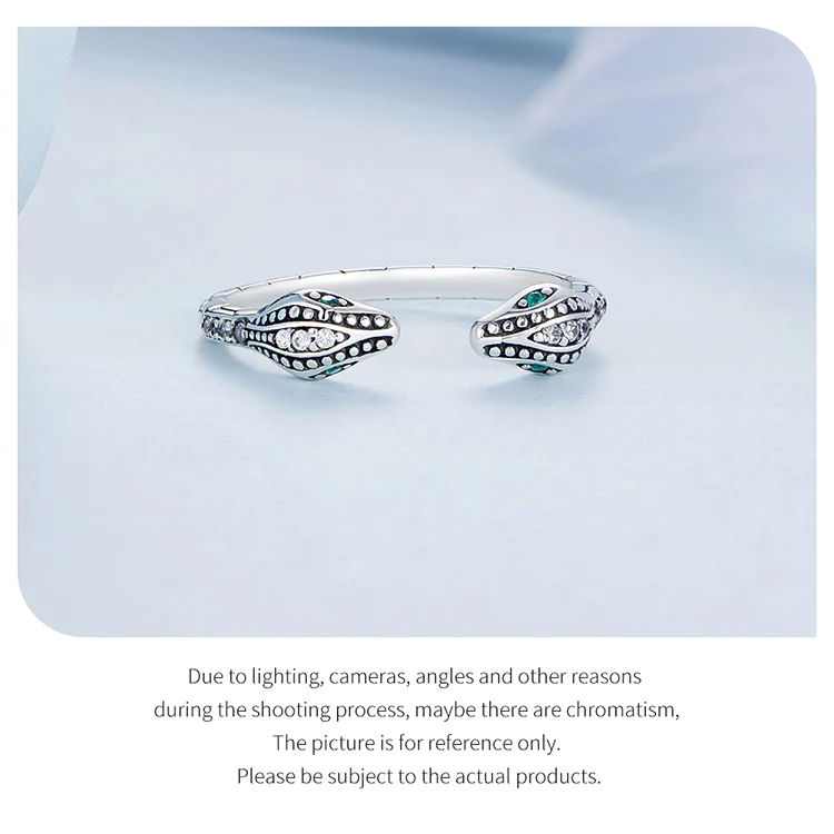❤ [Description] This open ring is made of double snakeheads with green eyes. The snakeheads have patterns composed of zircon and beads, which is mysterious and enchanting.