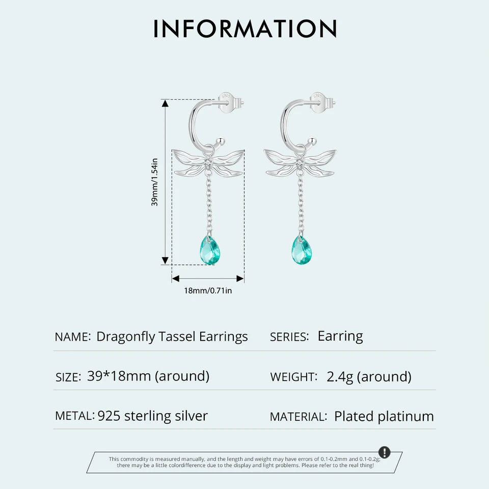 BAMOER 925 Sterling Silver Dragonfly Dangle Earrings, Tassel Tail adorned with Green Stones Studs Earrings for Teen Girls Women