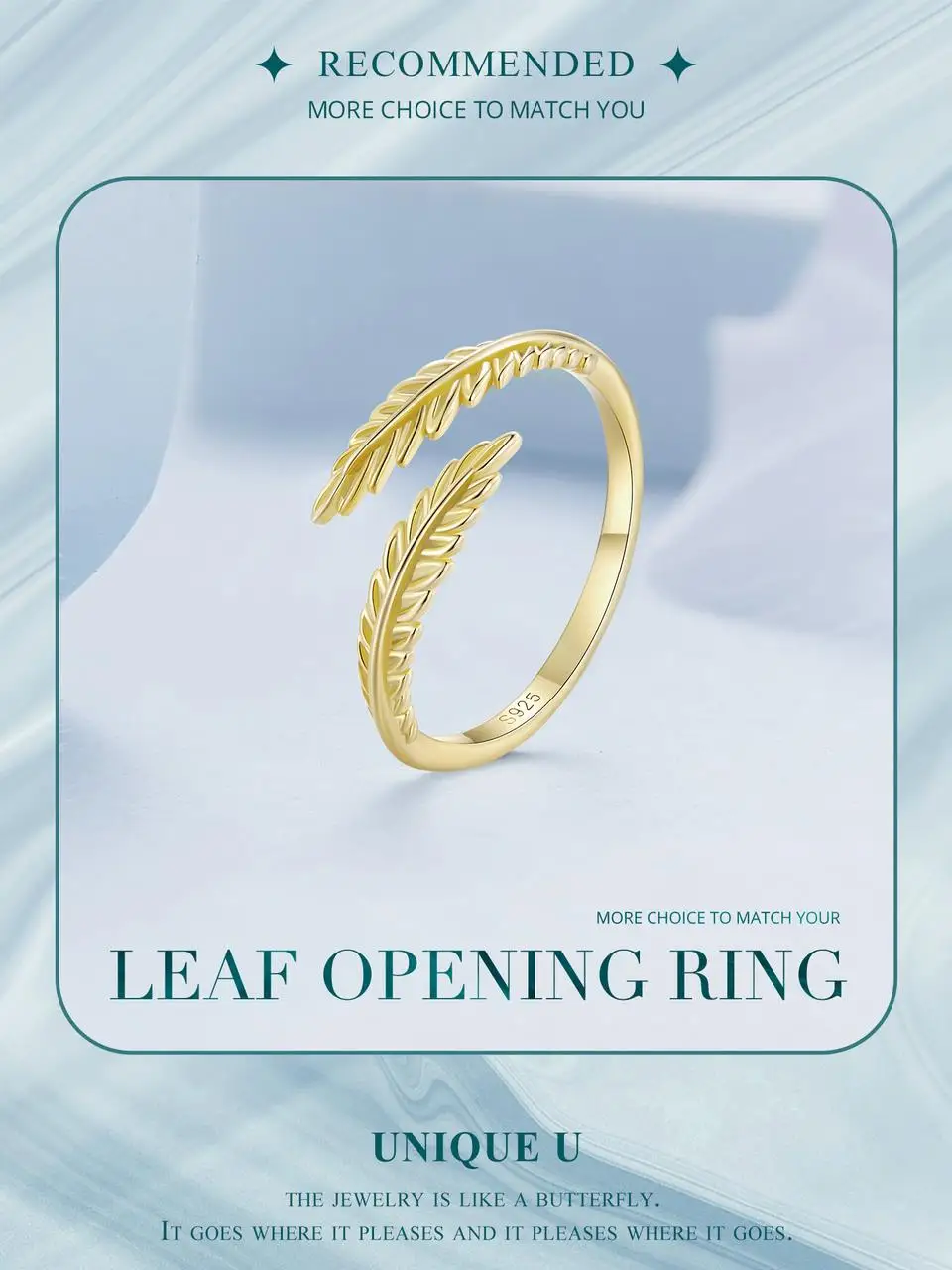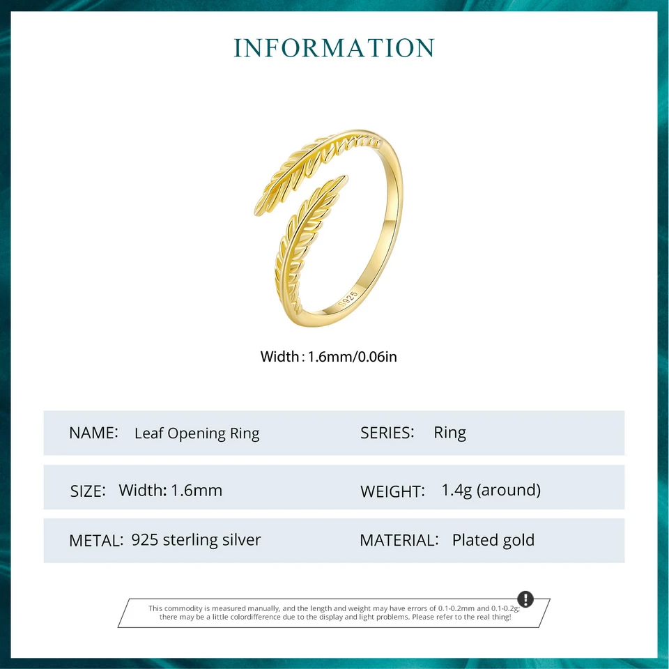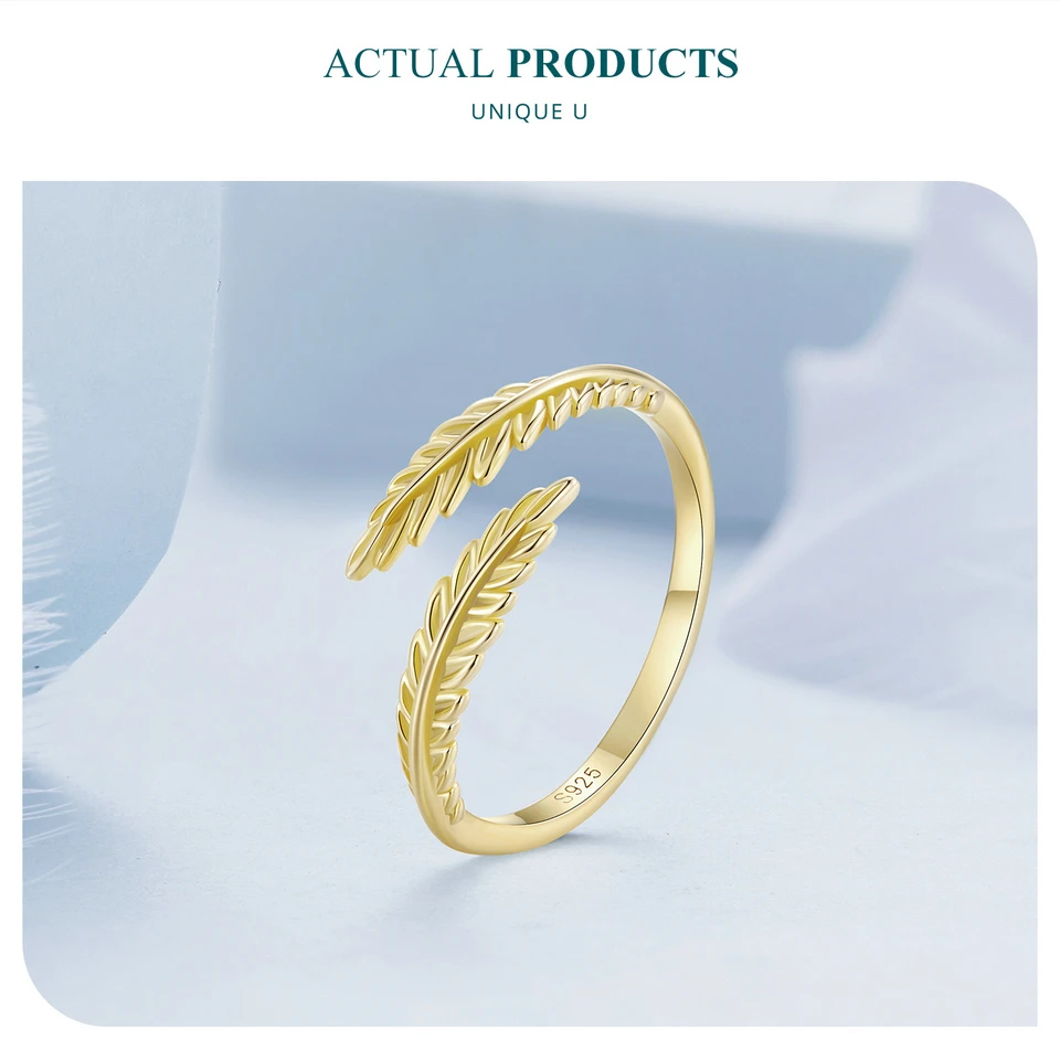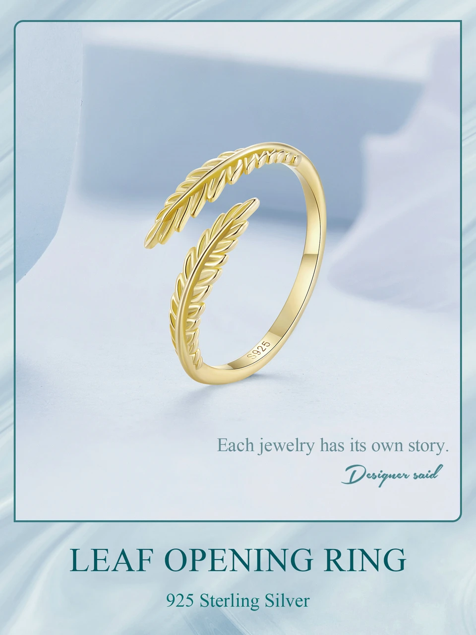 Bamoer 925 Sterling Silver Gold Leaf Opening Ring Simple Leaves Vine Adjustable Ring for Women Chic Fine Jewelry