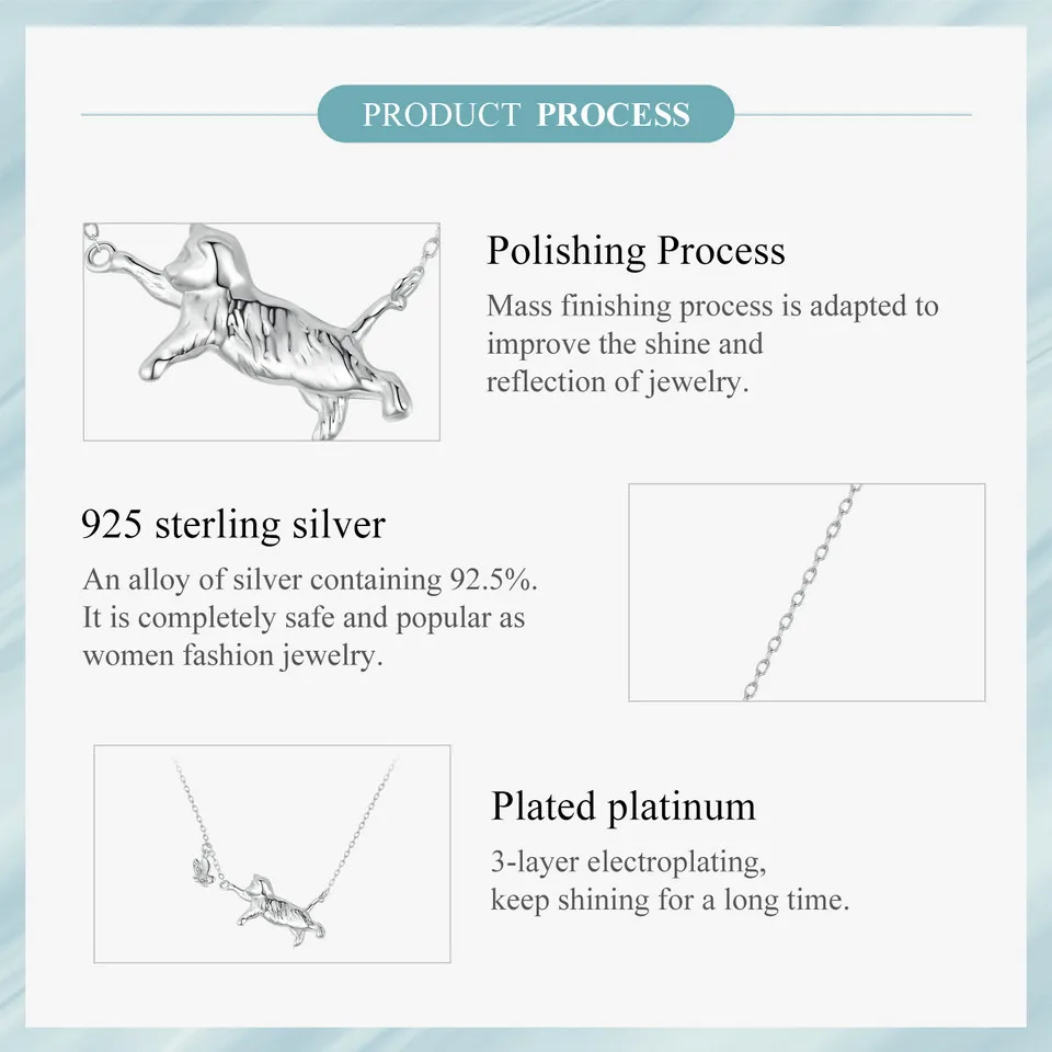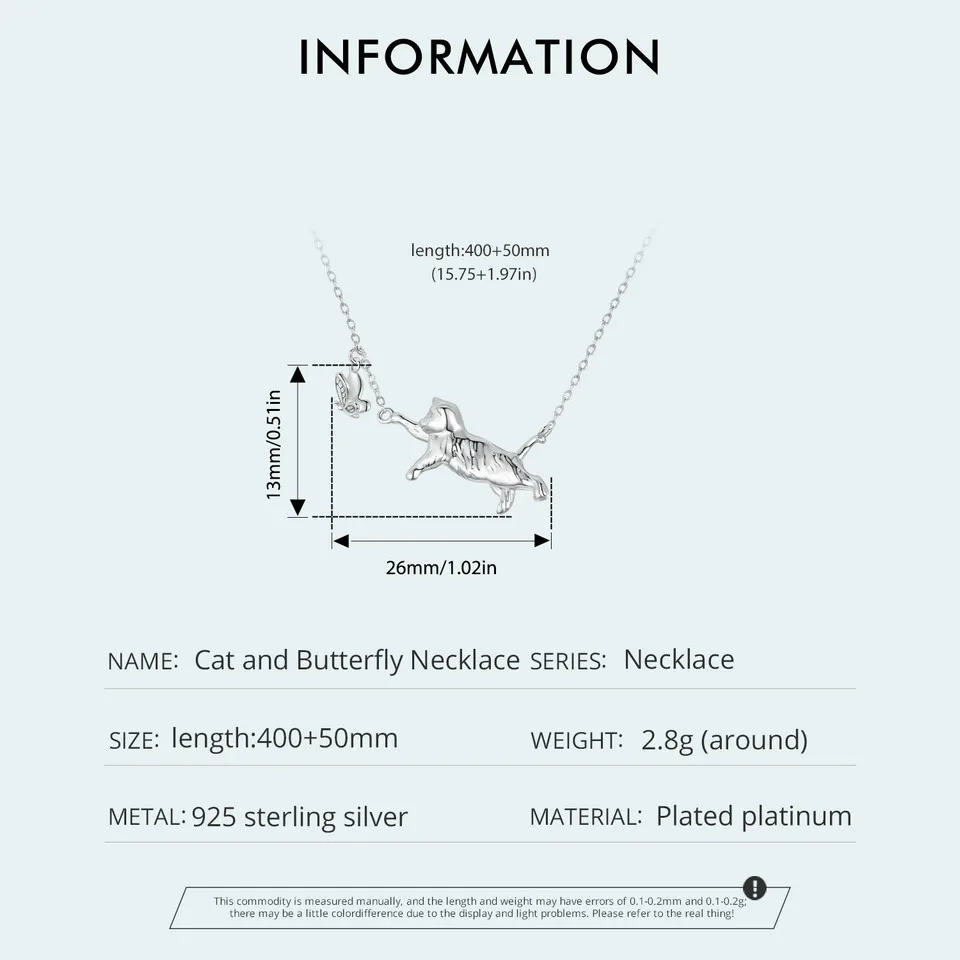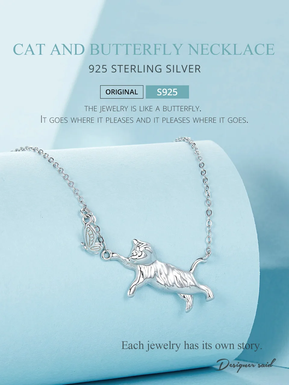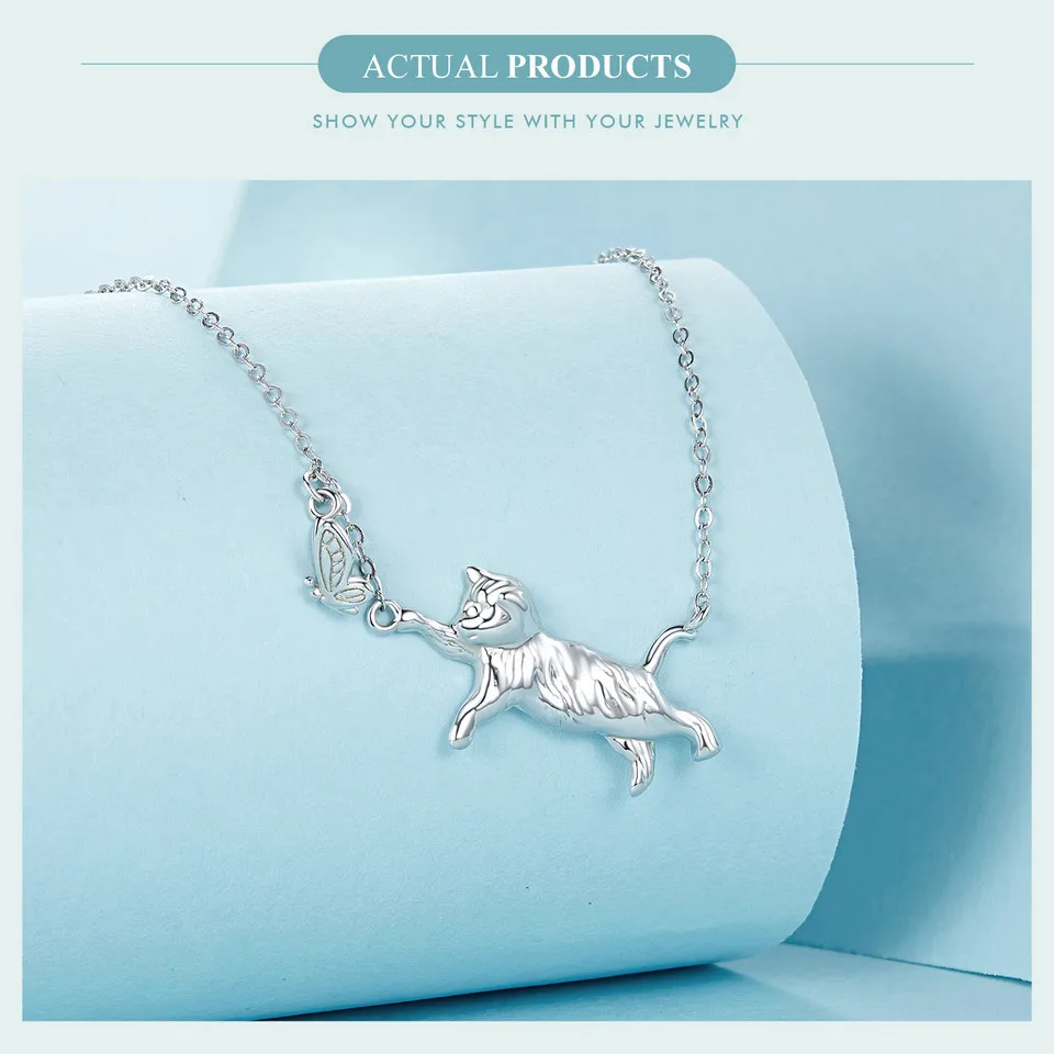 BAMOER 925 Sterling Silver Lovely Cat Pendant Necklace Flying Butterfly Neck Chain for Women Girls Daily Wearing Fine Jewelry