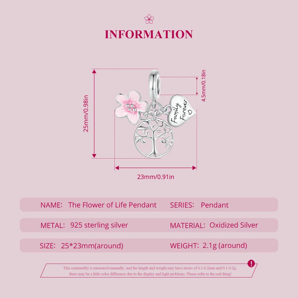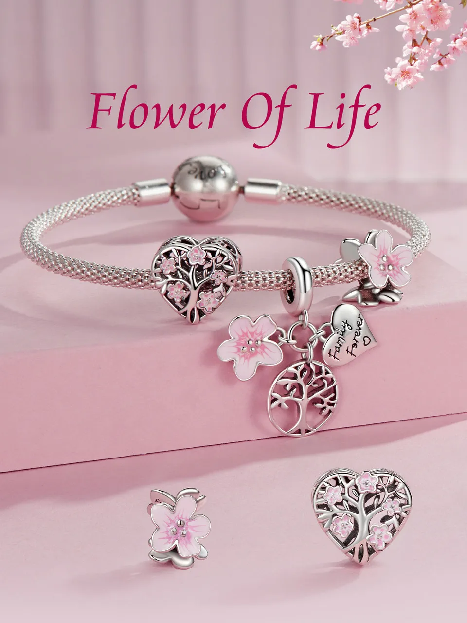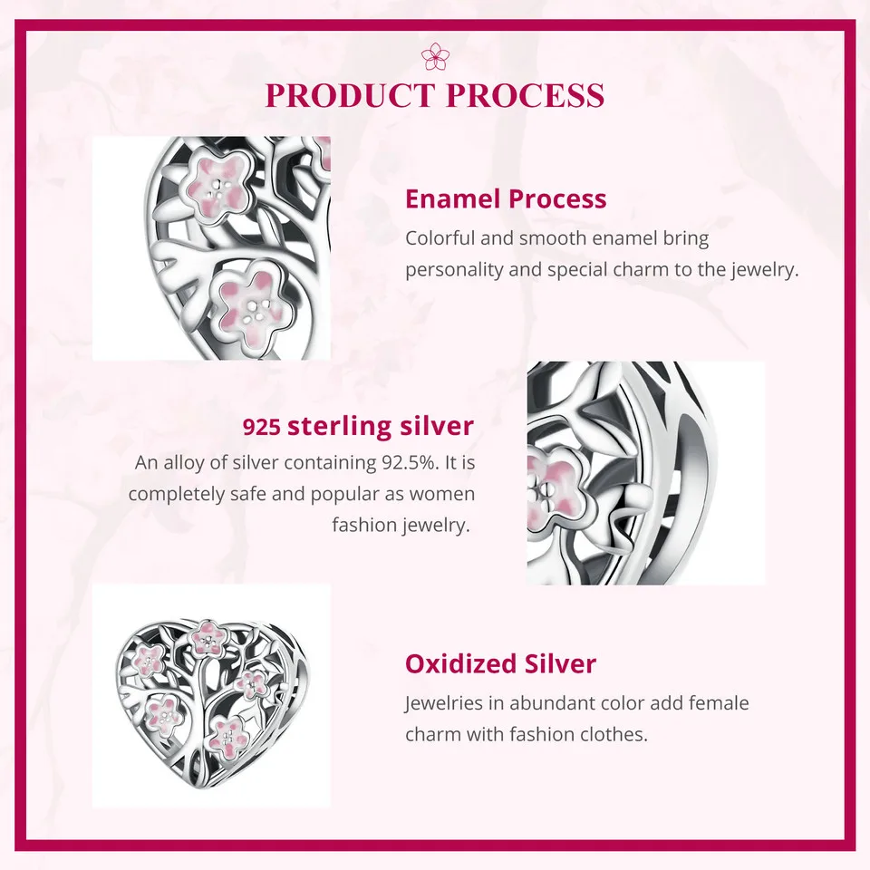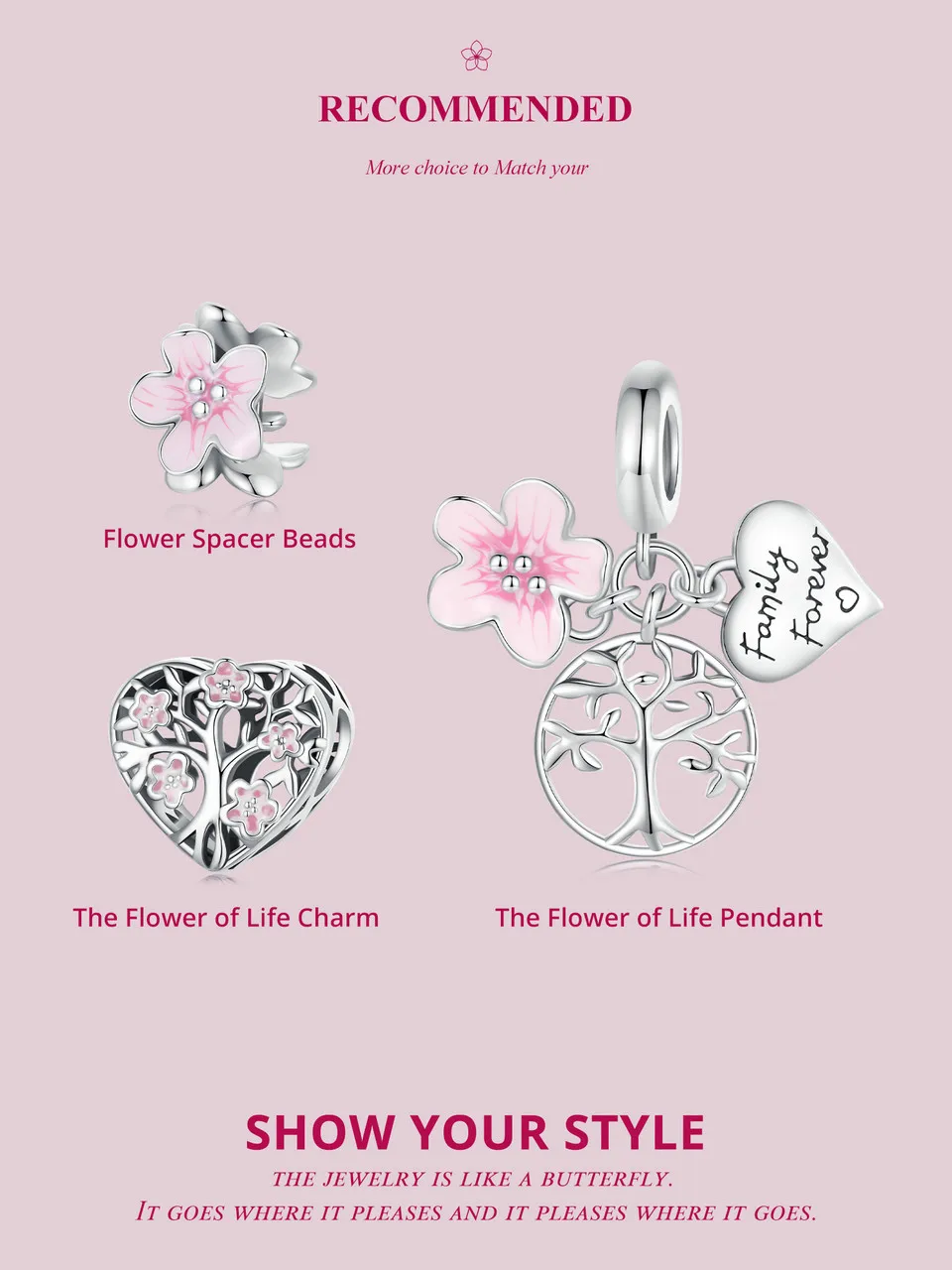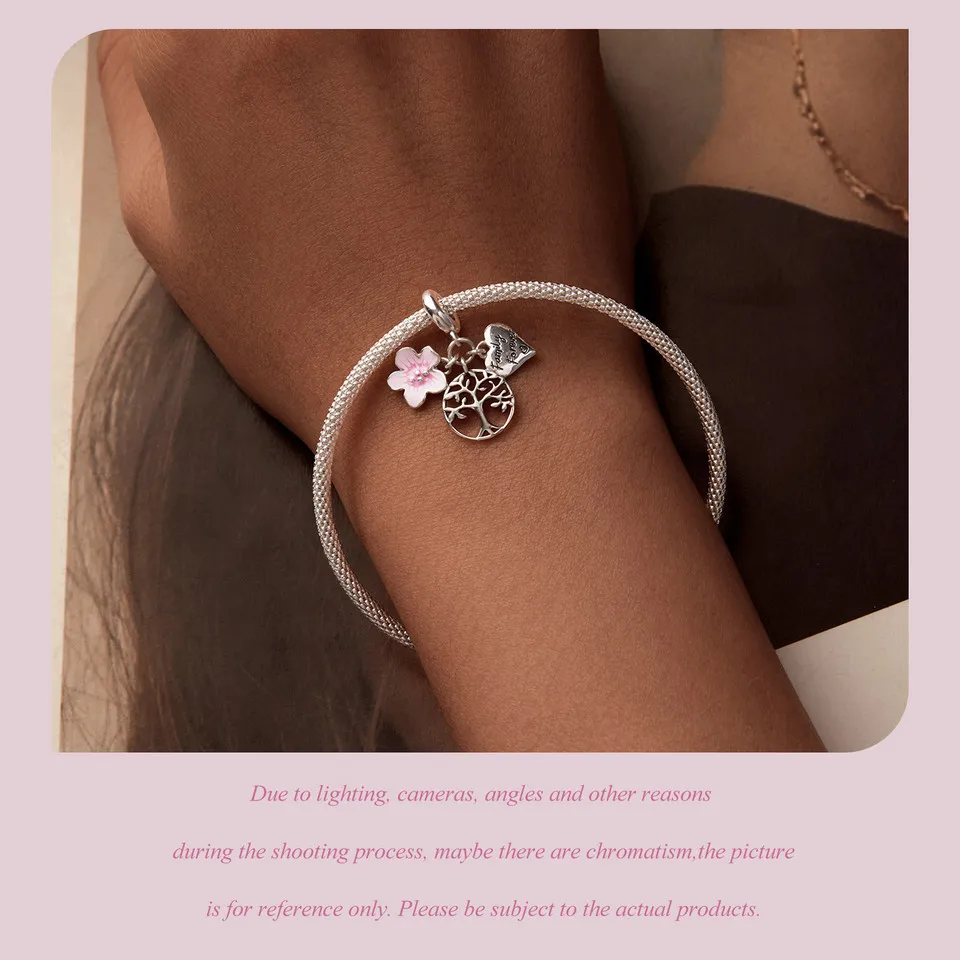 BAMOER 925 Sterling Silver Pink Flower Spacer Beads Tree of Life Charms for Women Bracelet Making Accessories