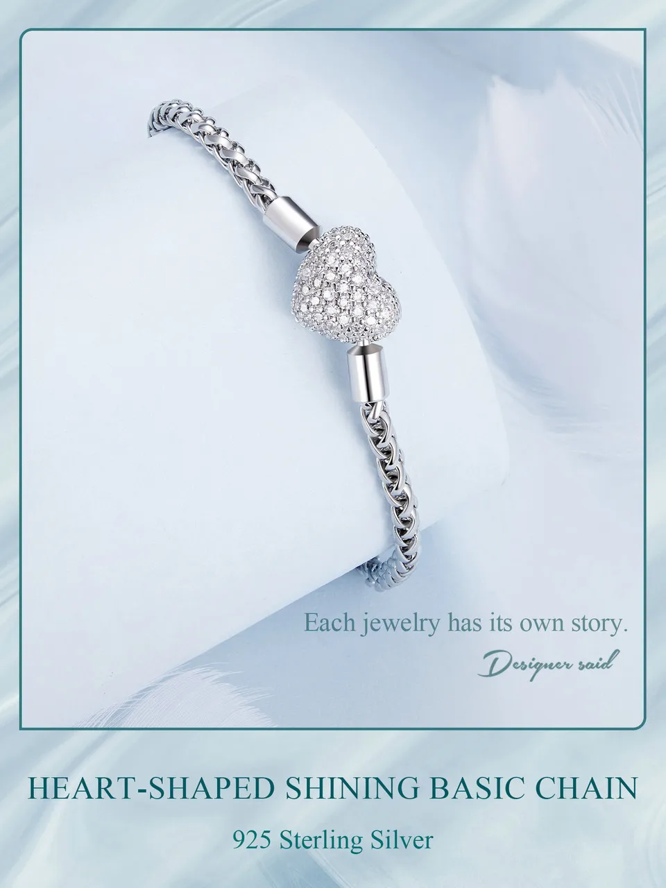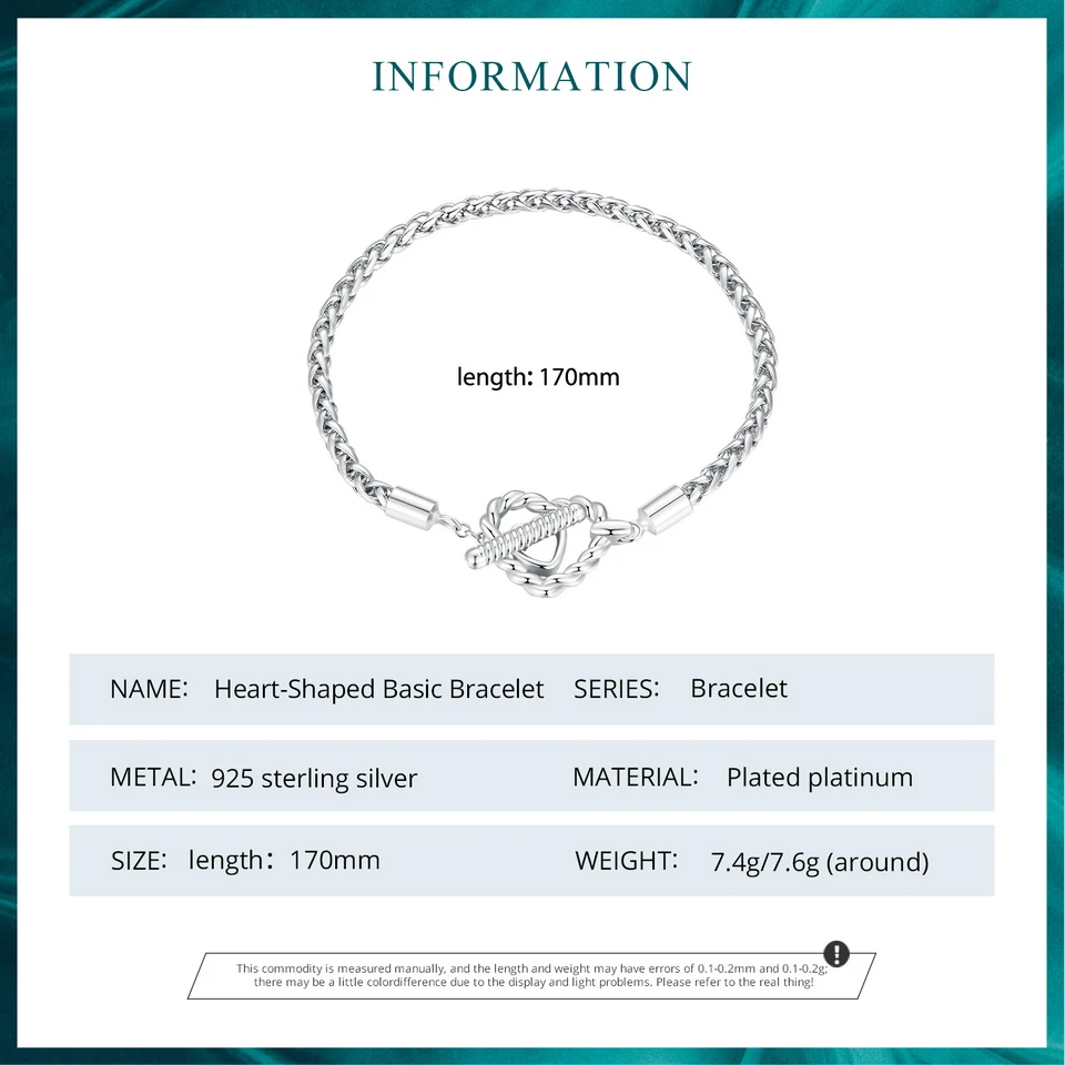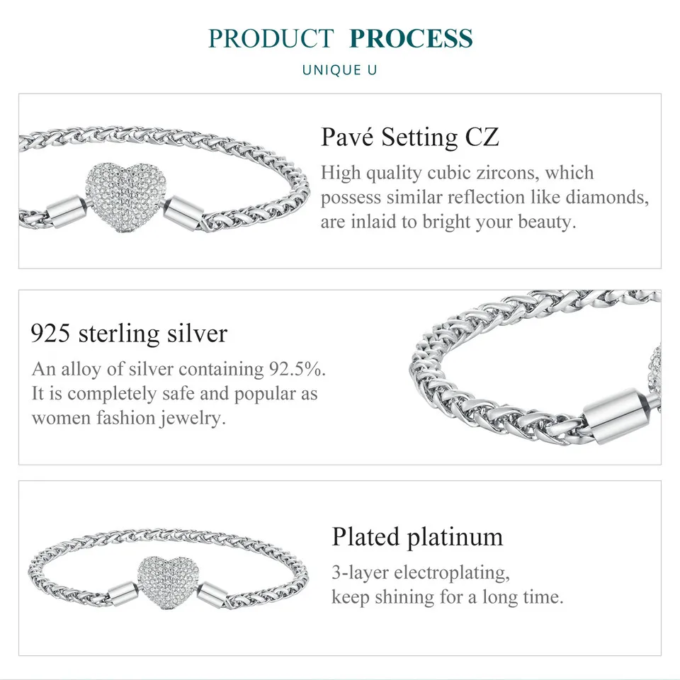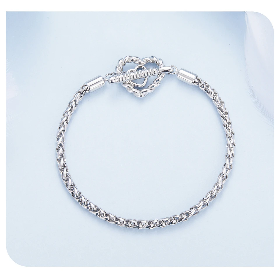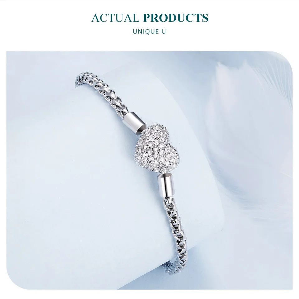 Bamoer 925 Sterling Silver Punk Style Braided Silver Chain Link Heart-Shaped Buckle Basic Bracelet Pave Setting CZ for Women