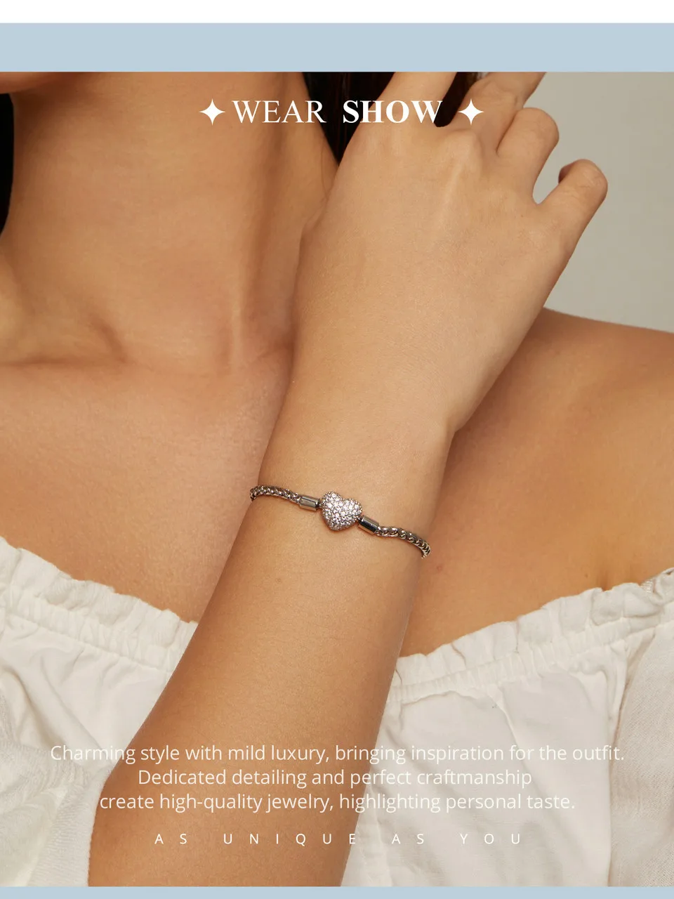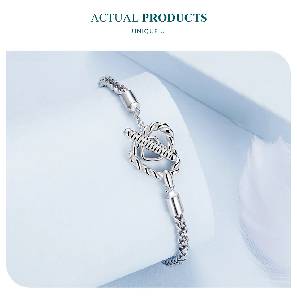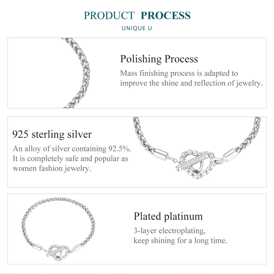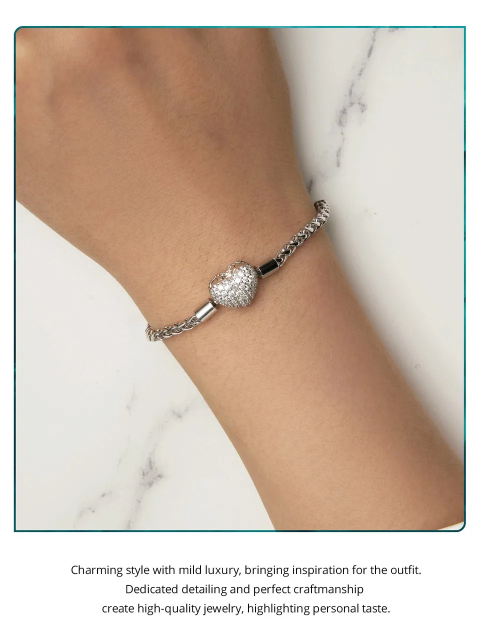 Bamoer 925 Sterling Silver Punk Style Braided Silver Chain Link Heart-Shaped Buckle Basic Bracelet Pave Setting CZ for Women