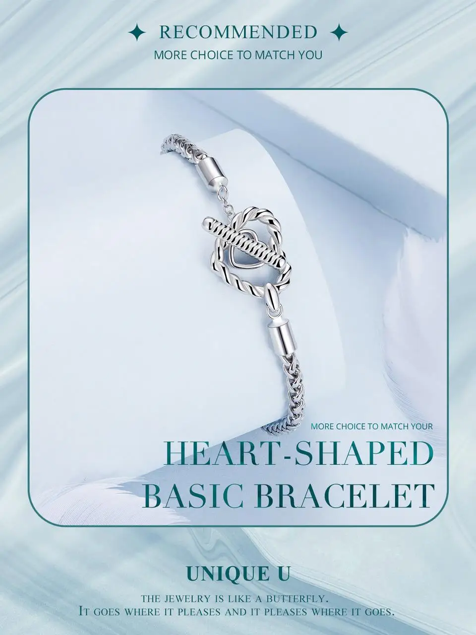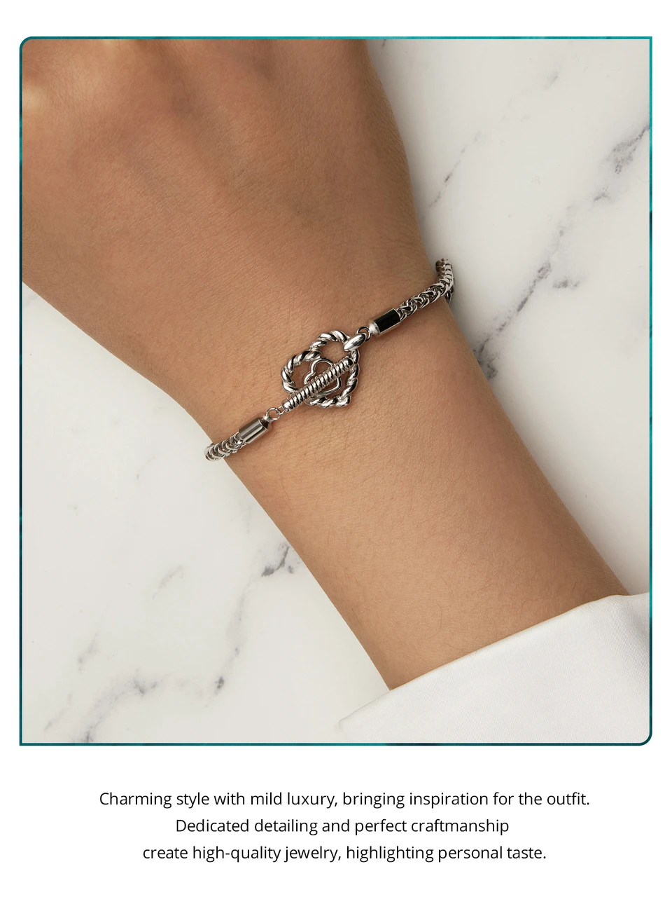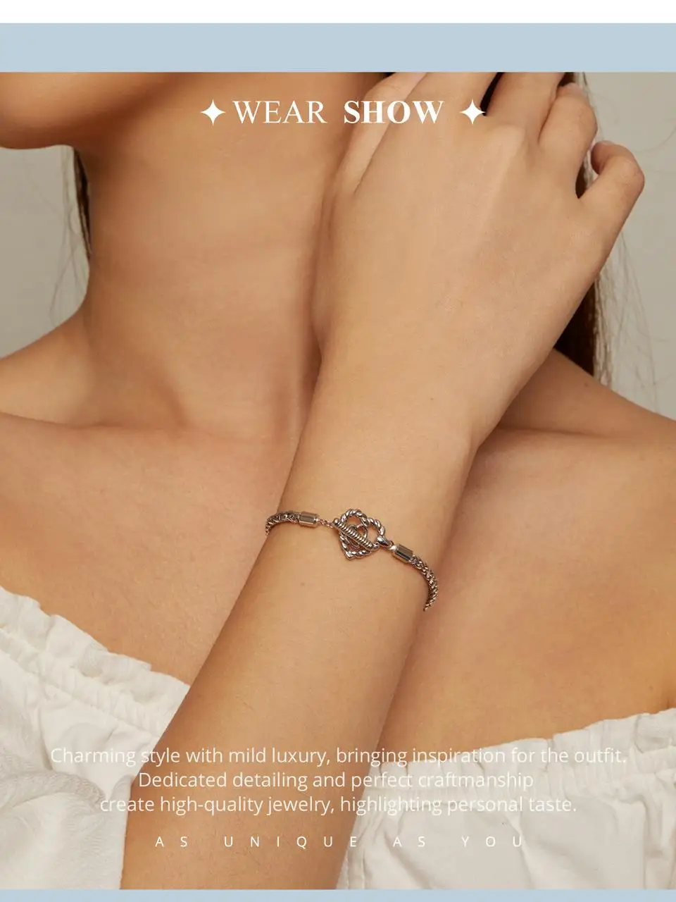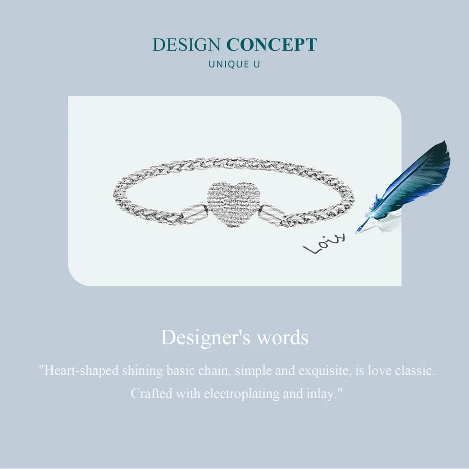Bamoer 925 Sterling Silver Punk Style Braided Silver Chain Link Heart-Shaped Buckle Basic Bracelet Pave Setting CZ for Women