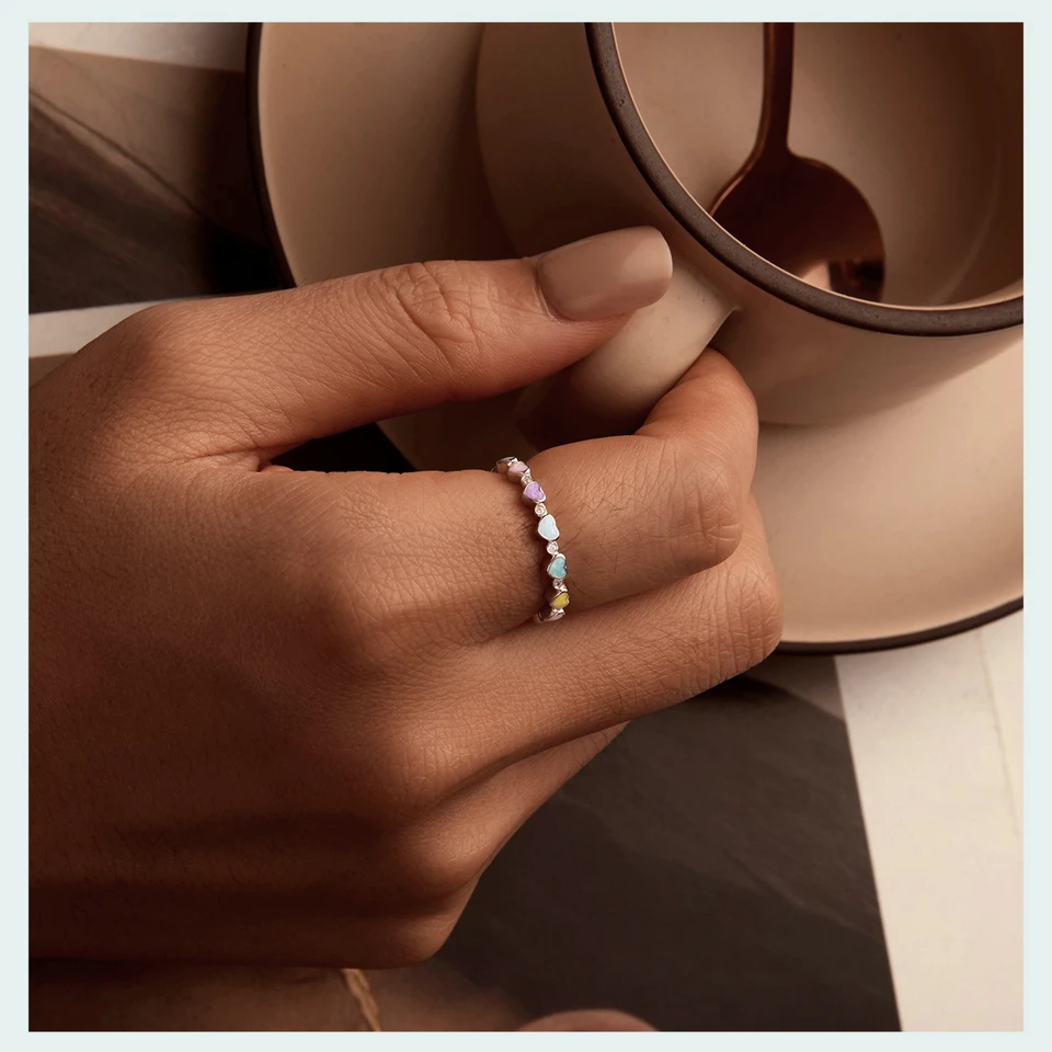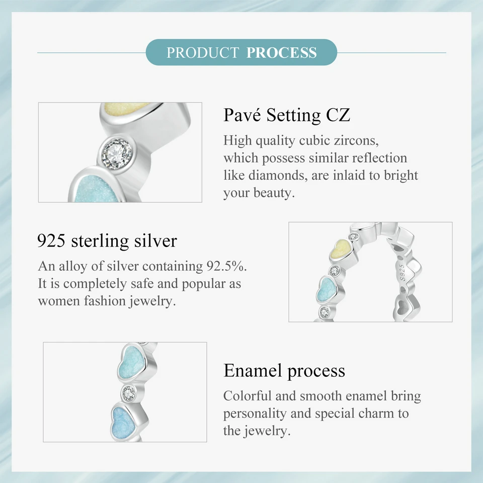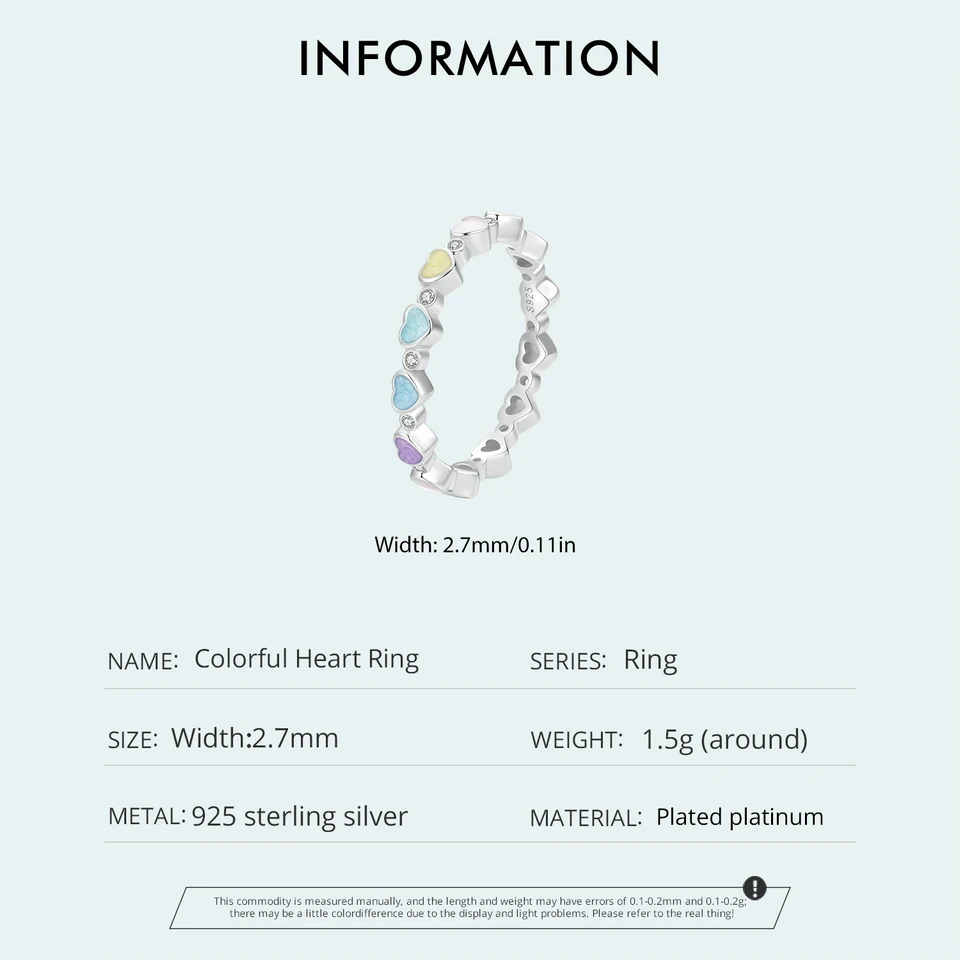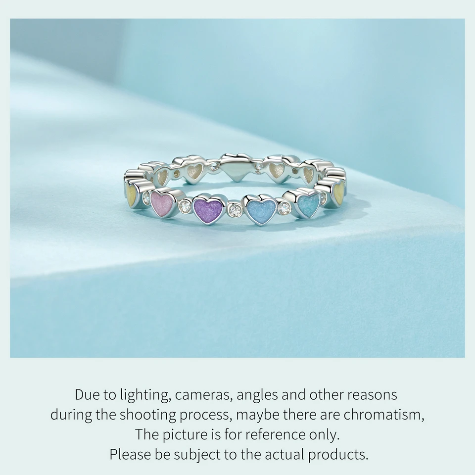 BAMOER 925 Sterling Silver Rainbow Heart Finger Ring Stackable Zircon Ring for Women Trendy Fashion Jewelry Gift