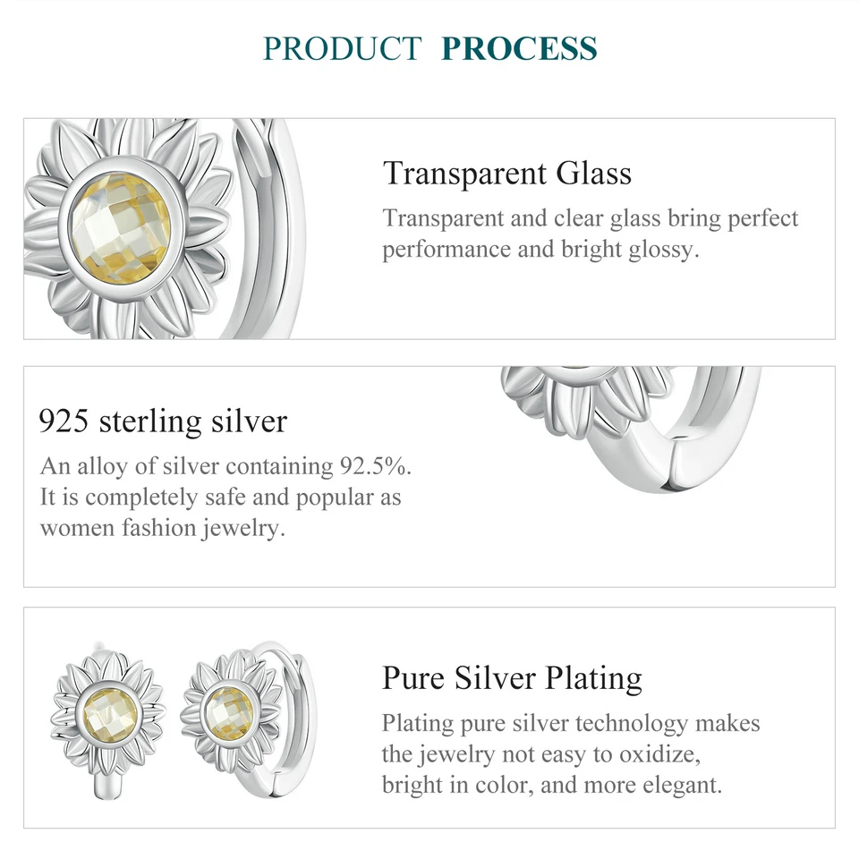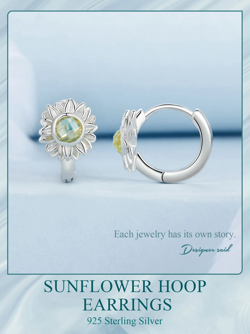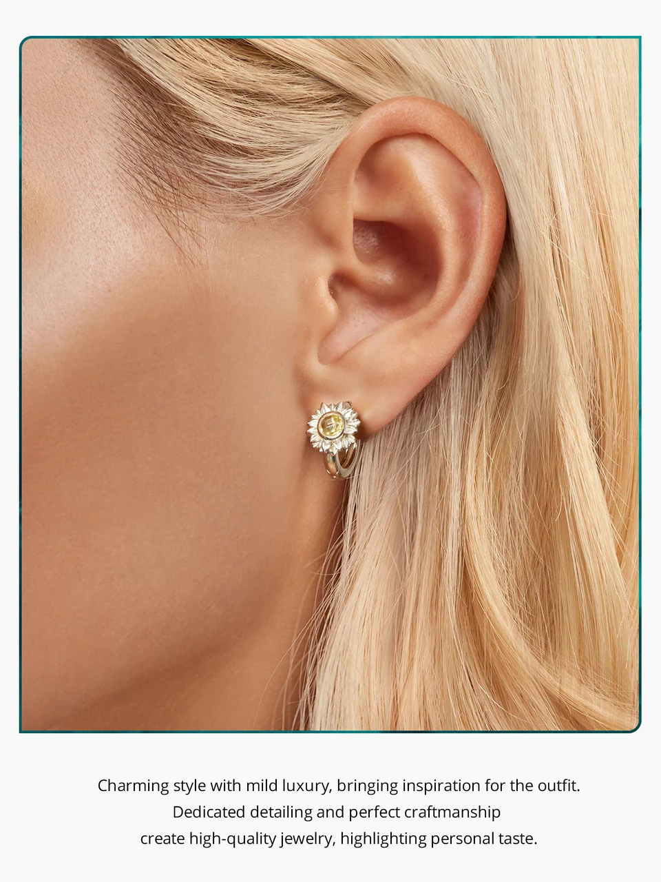 ❤ [Description] The sunflower hoop earrings with a central yellow stone, symbolizing growth towards the sun, bravery, brightness, and openness.