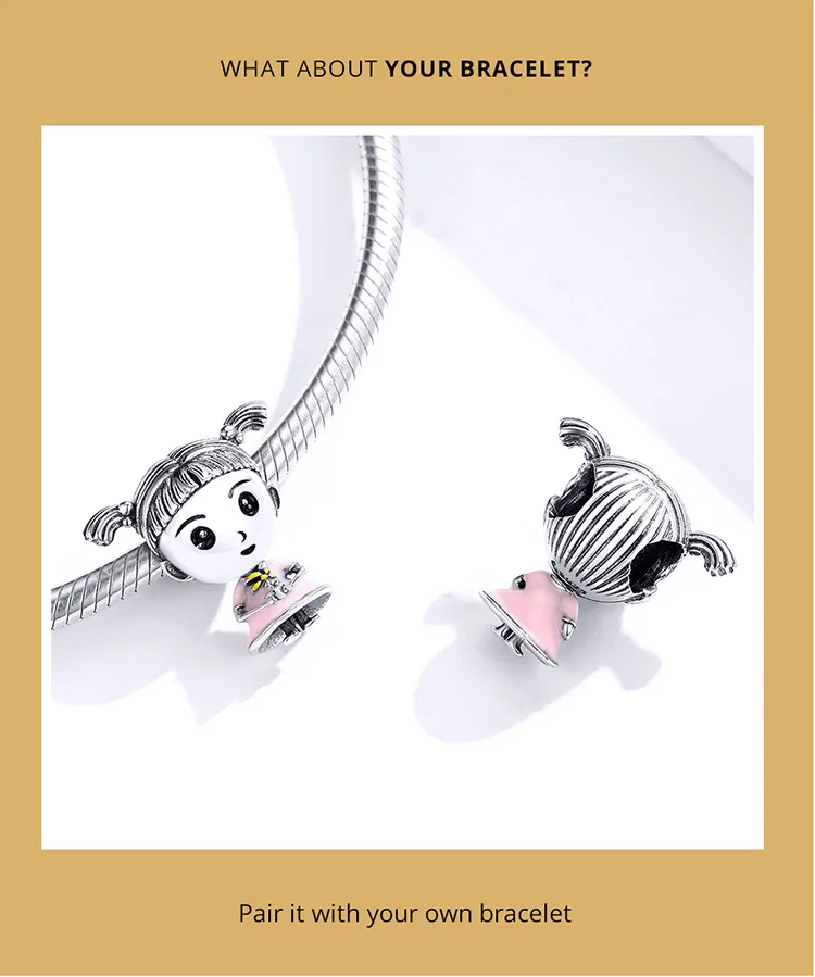 Material: S925+Oxidized silver+Enamel process Size:1.6*1.6cm Description: Playful cute little girl is the little princess in the family. The charm have active body, and the funny design will bring the different fun for your bracelet.