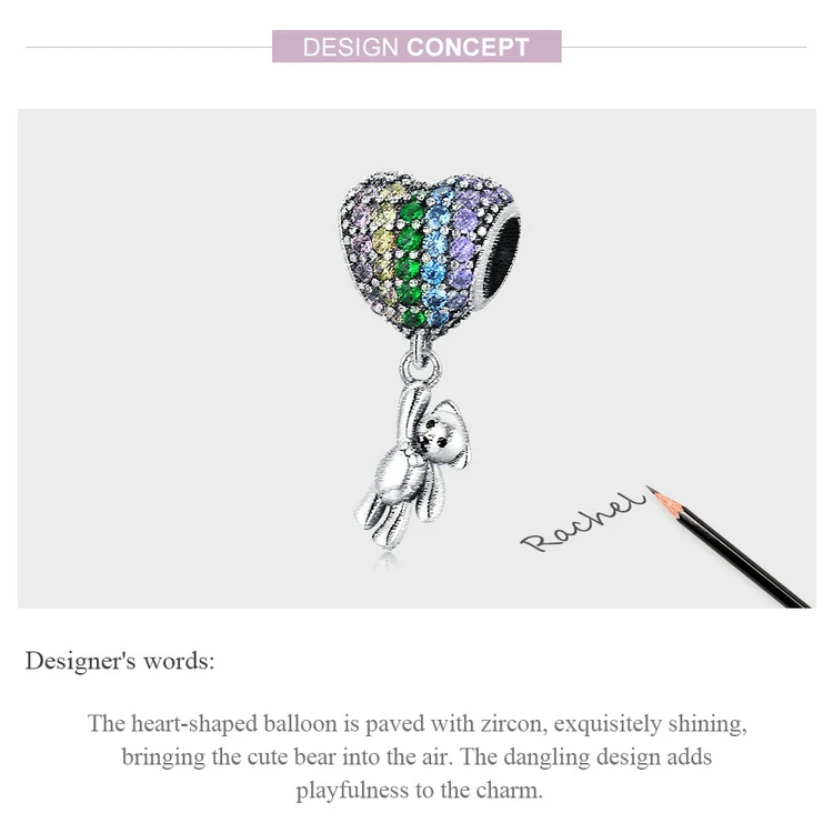 ❤ [Description]The heart-shaped balloon is paved with zircon, exquisitely shining, bringing the cute bear into the air. The dangling design adds playfulness to the charm.