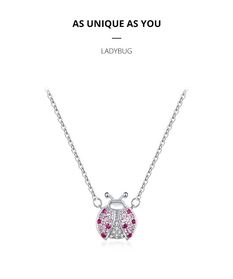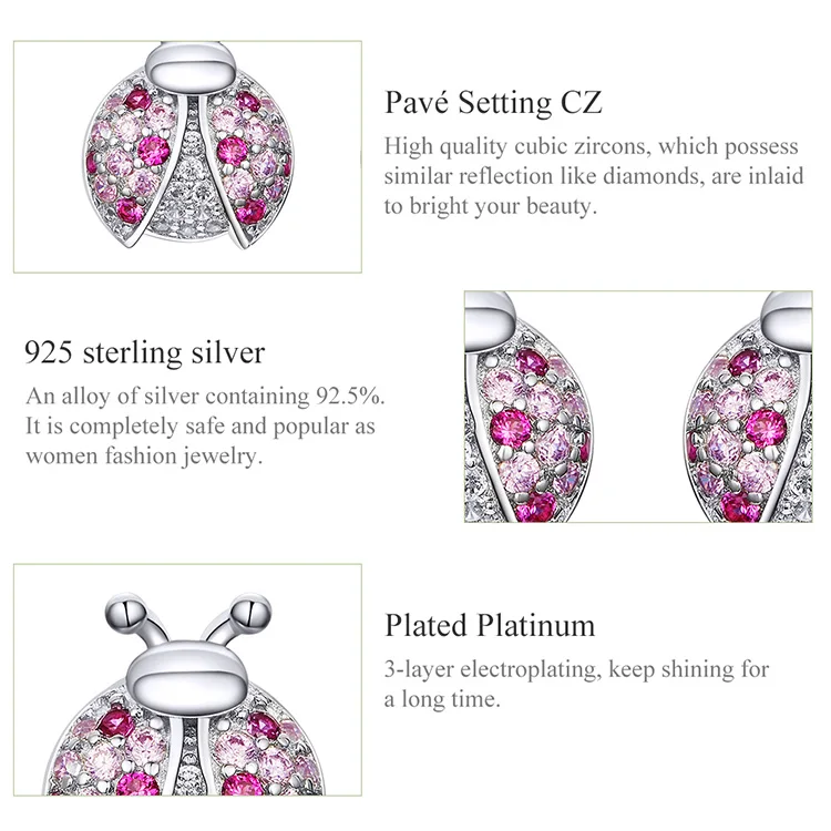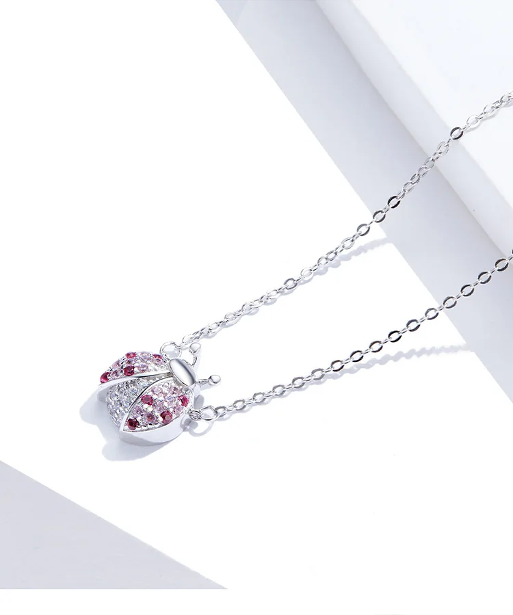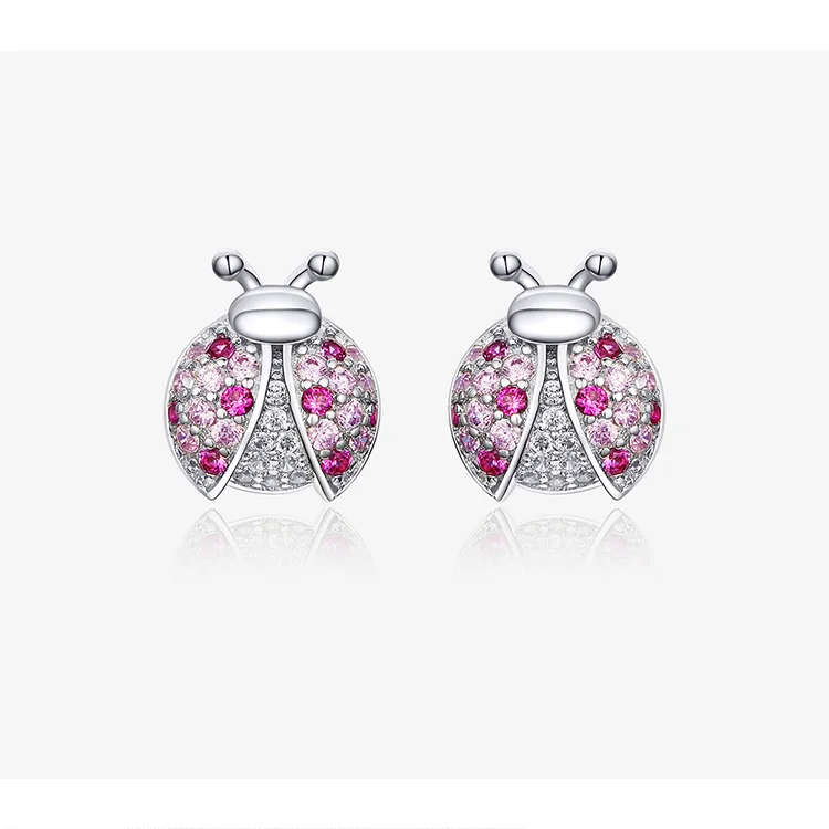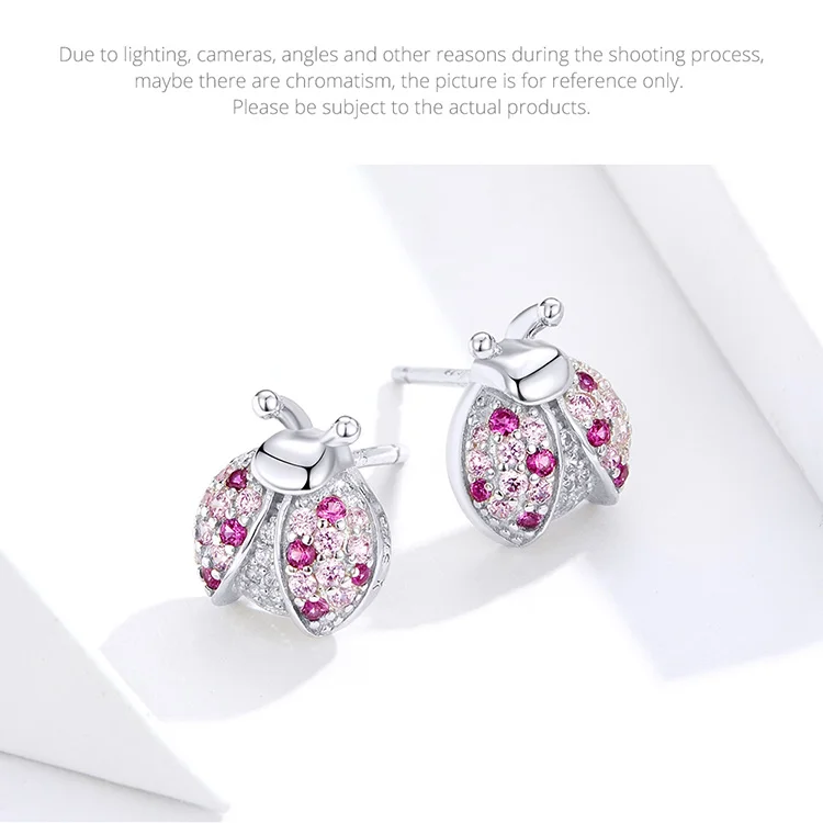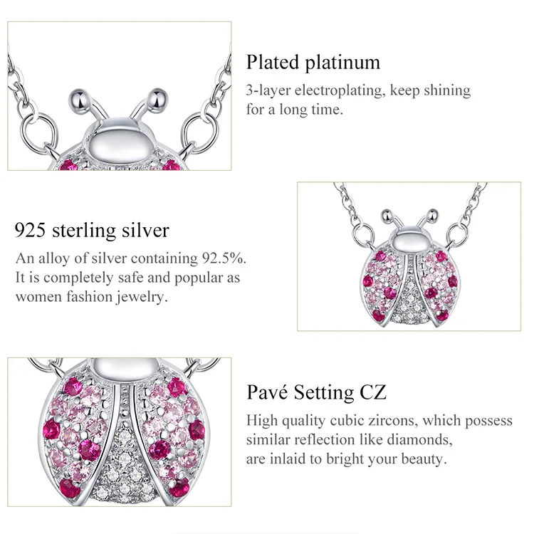BISAER 925 Sterling Silver Pink Laybug Jewelry Set Pavé Setting Zircon Necklace Earrings Plated Platinum For Romantic Women Gift